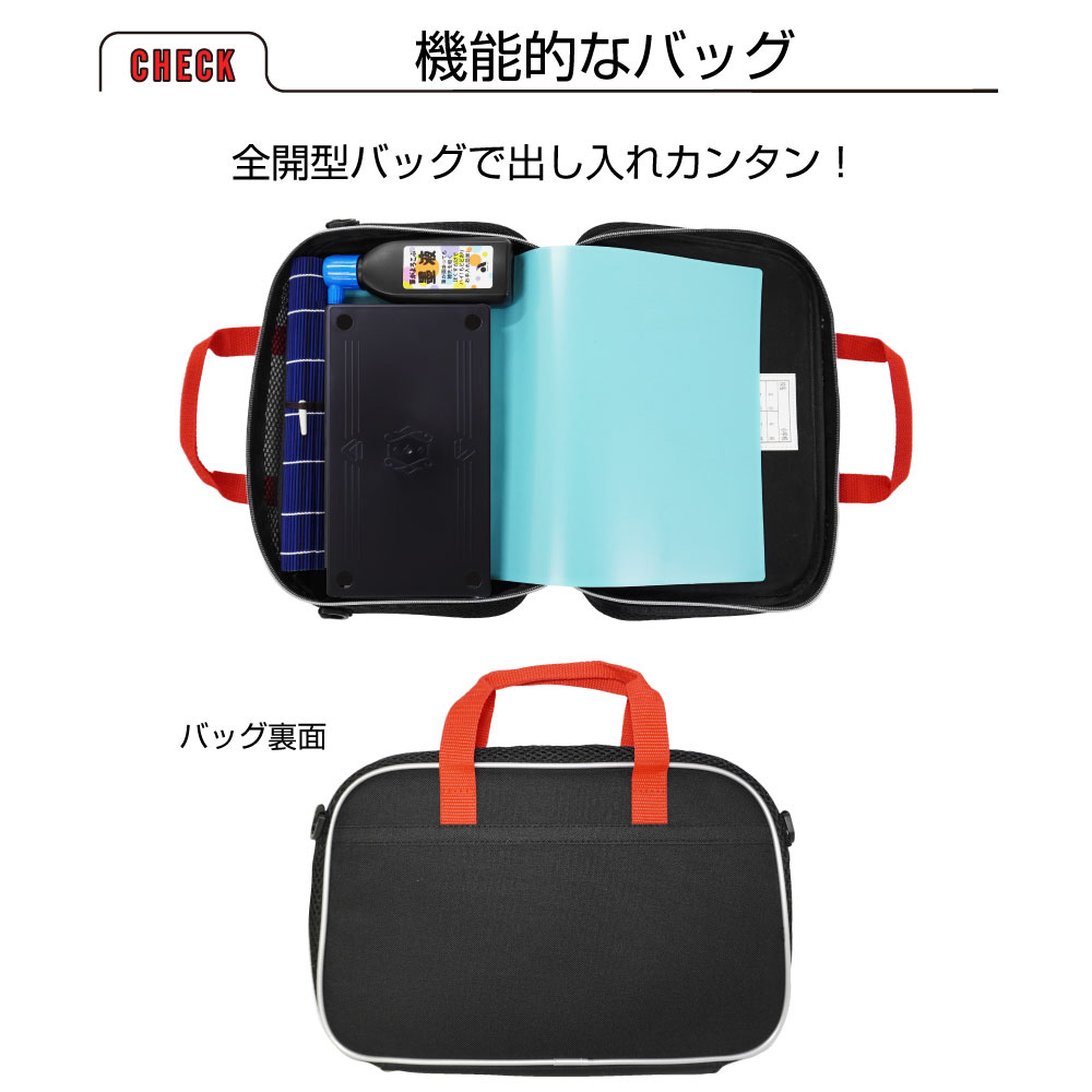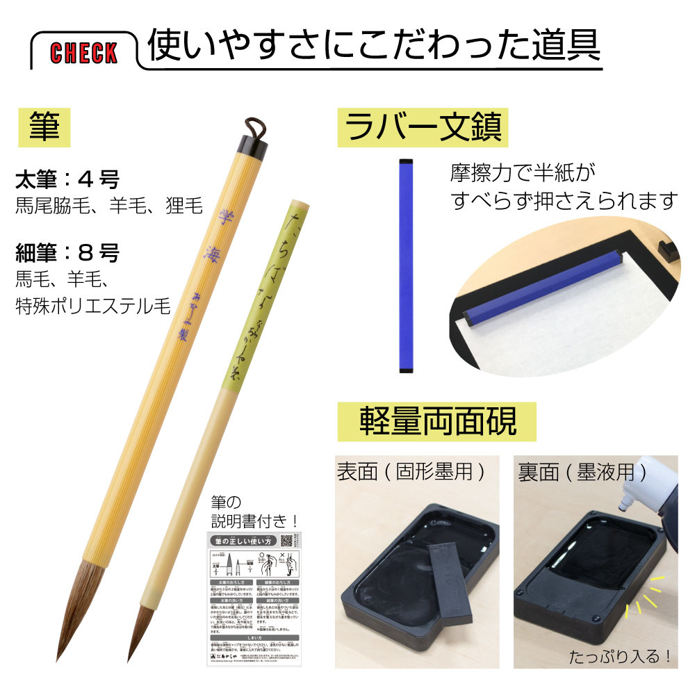 太筆、細筆、固形墨、墨液(180mL)、軽量両面硯(表面:硯、裏面:墨池)、ラバー文鎮(185g)、下敷、半紙ばさみ、筆巻、スポイト式水差し、書道具収納ケース(左右両用・筆置き兼用)、筆の説明書、ショルダーベルト