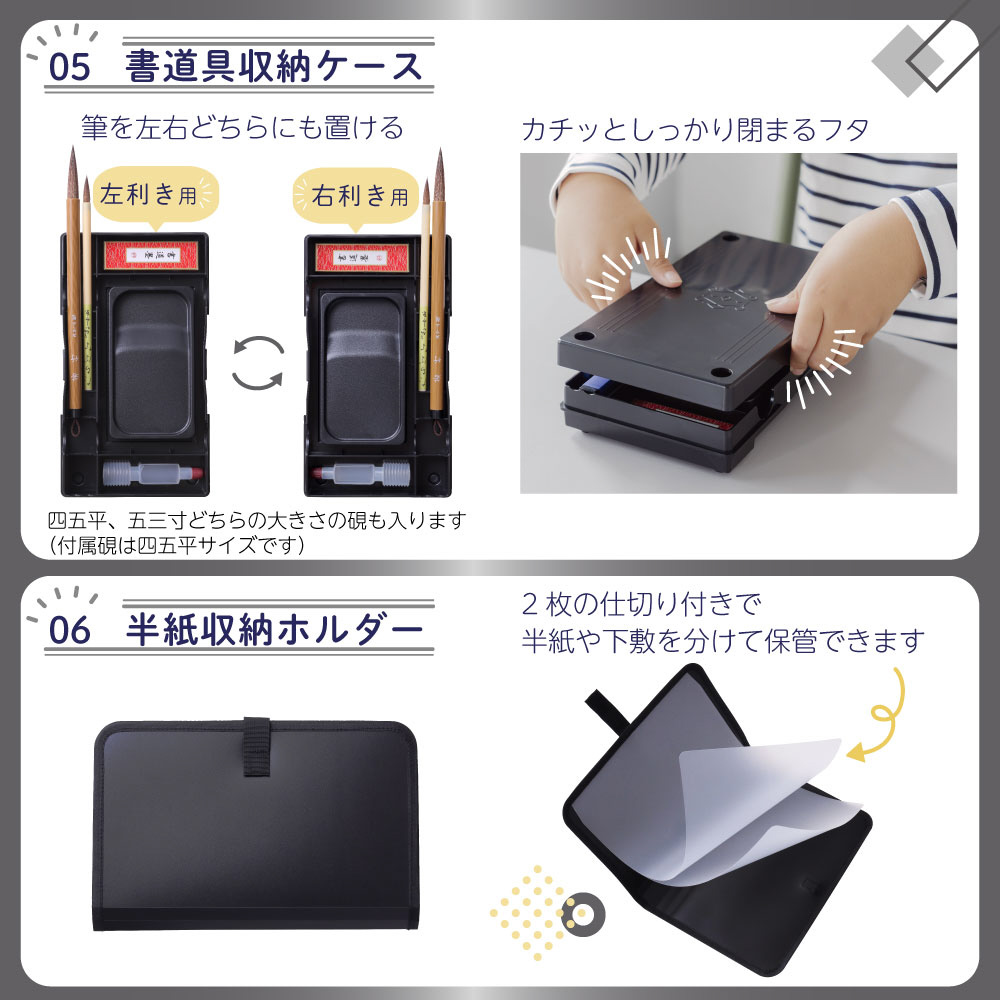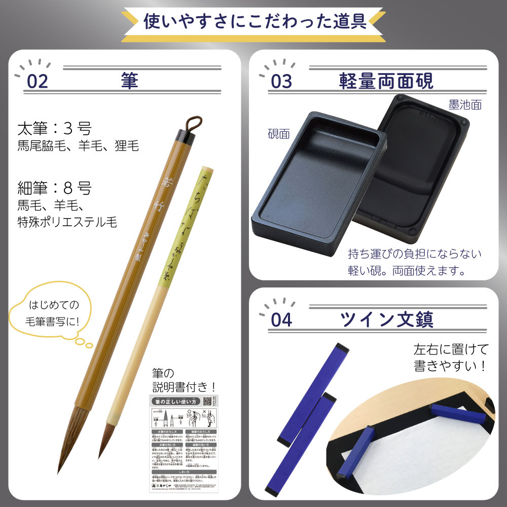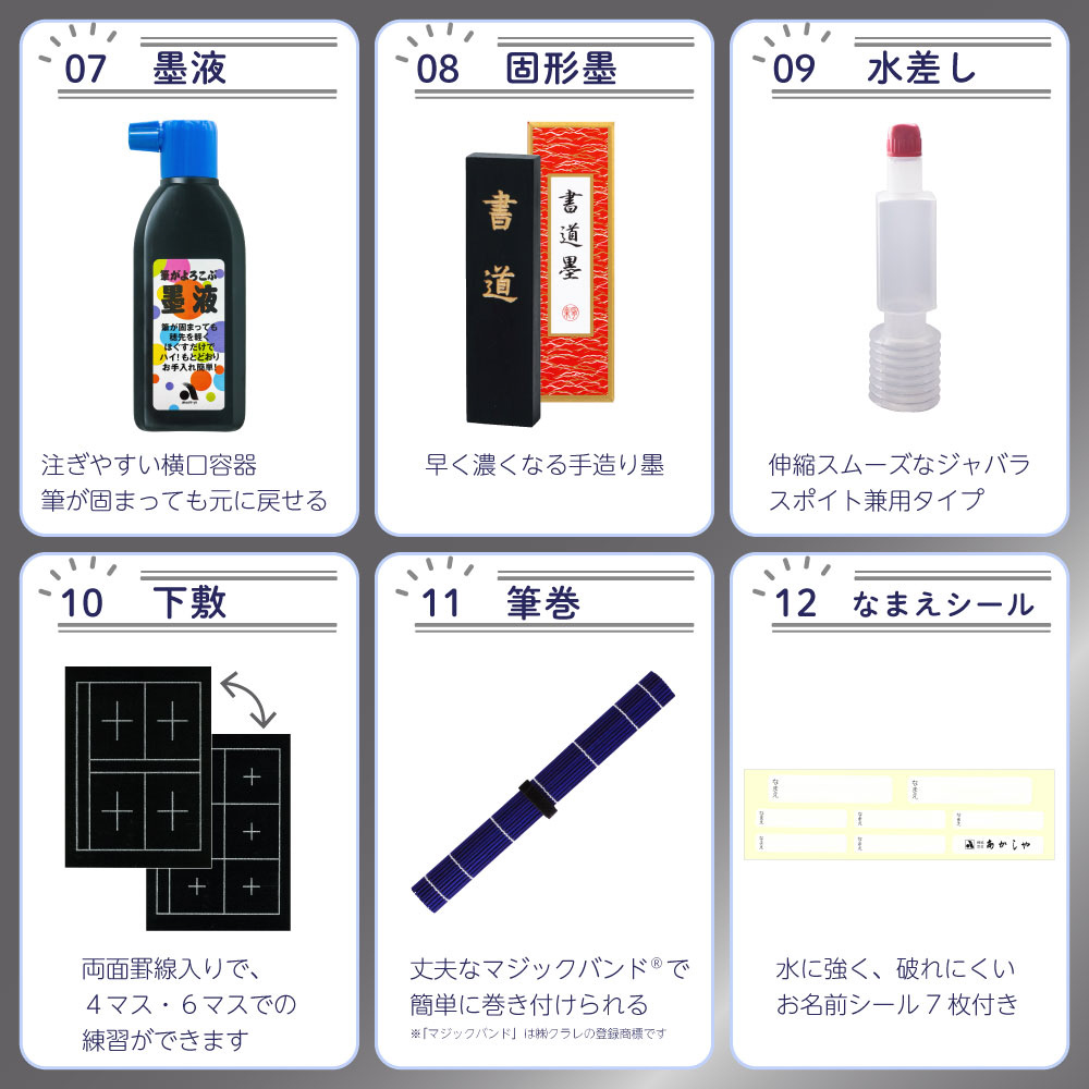 太筆、細筆、固形墨、墨液(180mL)、軽量両面硯(表面:硯、裏面:墨池)、ラバーツイン文鎮(185g)、下敷(4マス・6マス両面罫線入り)、半紙収納ホルダー、筆巻(マジックバンドタイプ)、スポイト式水差し、書道具収納ケース(左右両用・筆置き兼用)、筆の説明書、なまえシール、ショルダーベルト