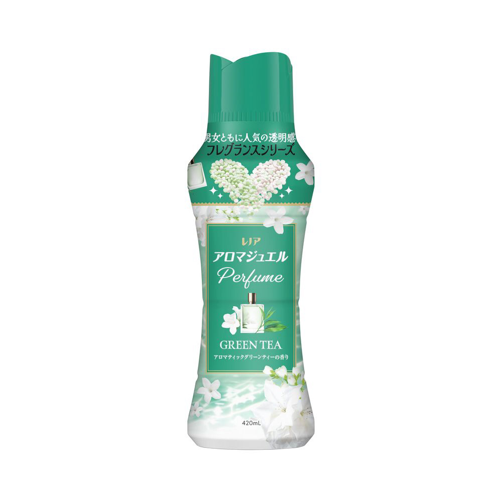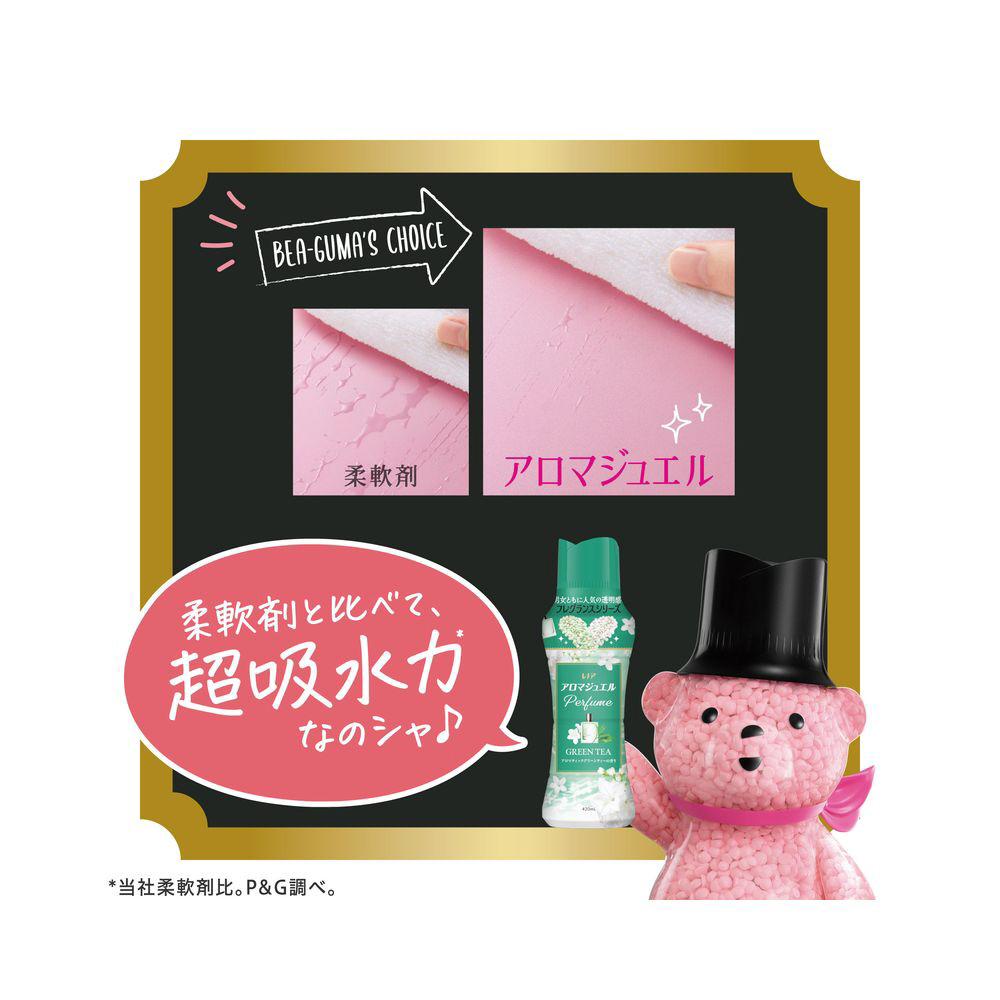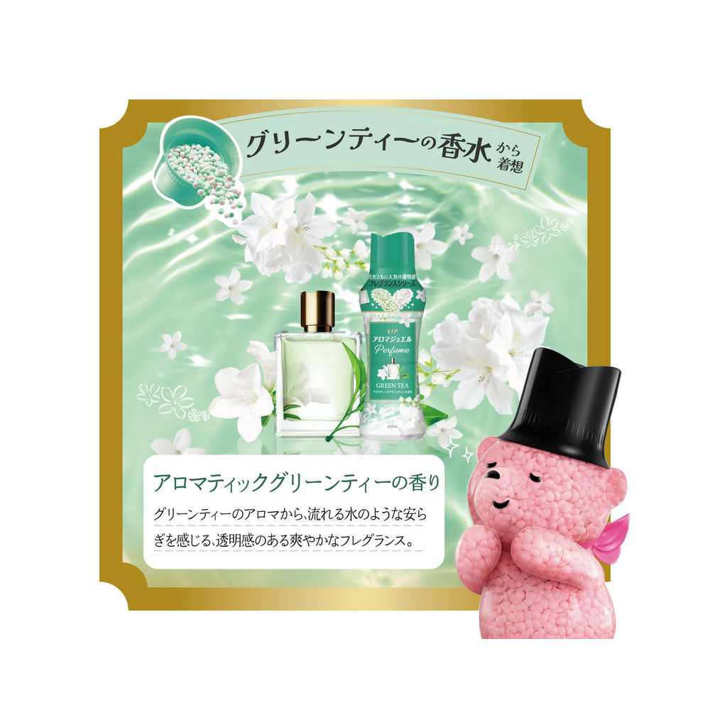 柔軟剤と比べて、超吸水力*&香り長続き2色の香水ビーズ。複雑で深みのある香り。柔軟剤より上質なフレグランスが香水よりやさしく、長く続きます。グリーンティーの香水から着想 アロマティックグリーンティーの香り グリーンティーのアロマから、流れる水のような安らぎを感じる、透明感のある爽やかなフレグランス。お洗濯のはじめに入れるだけ!縦型・ドラム式どちらでもOK* 当社柔軟剤比。複数回洗濯後。 香り付け専用ビーズ