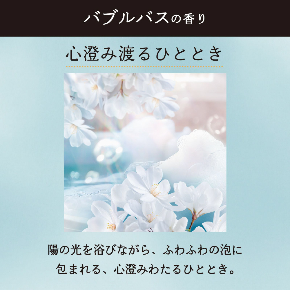 ●バブルバスの香り心がふりむく香りの柔軟剤 心澄み渡るひととき: 陽の光を浴びながら、ふわふわの泡に包まれる。