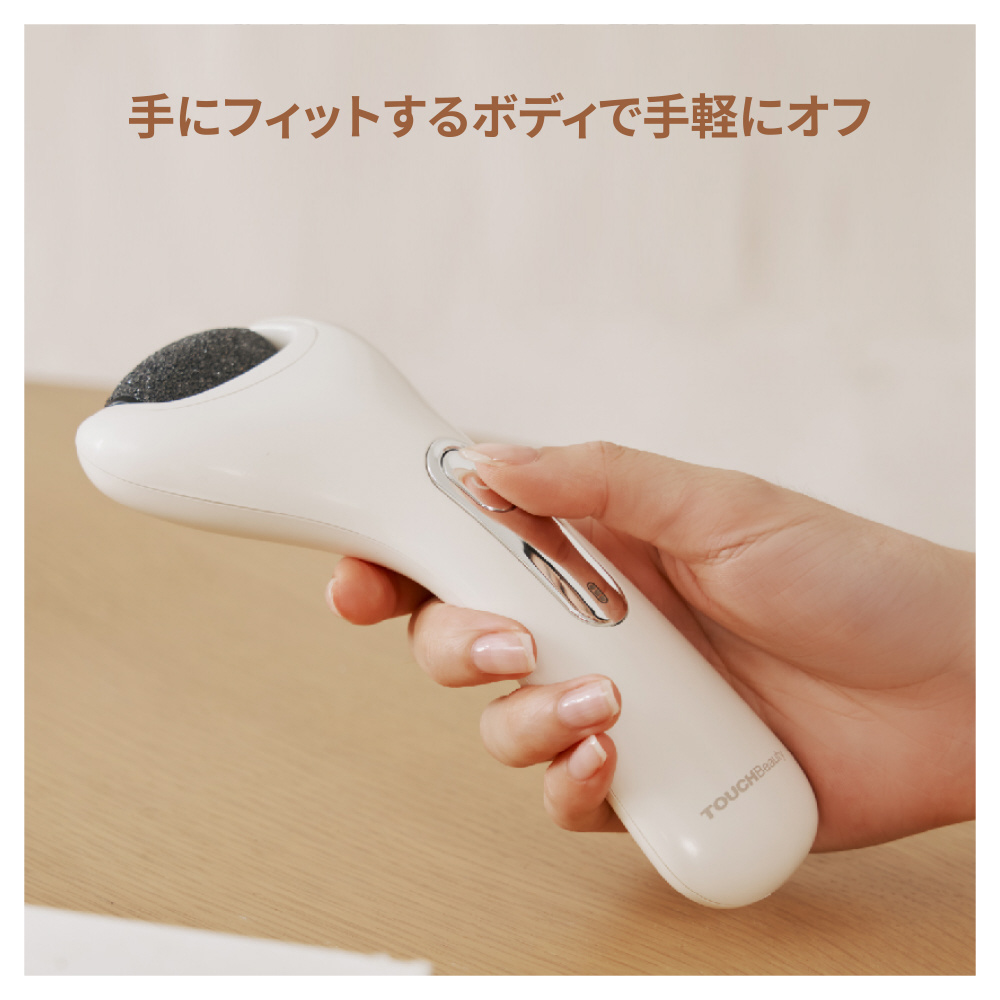 手にフィットするデザインが特長。独自開発のモーターで固くなった角質もスムーズにケア。手作業では大変な、かかとケアも片手で楽々完了します。
