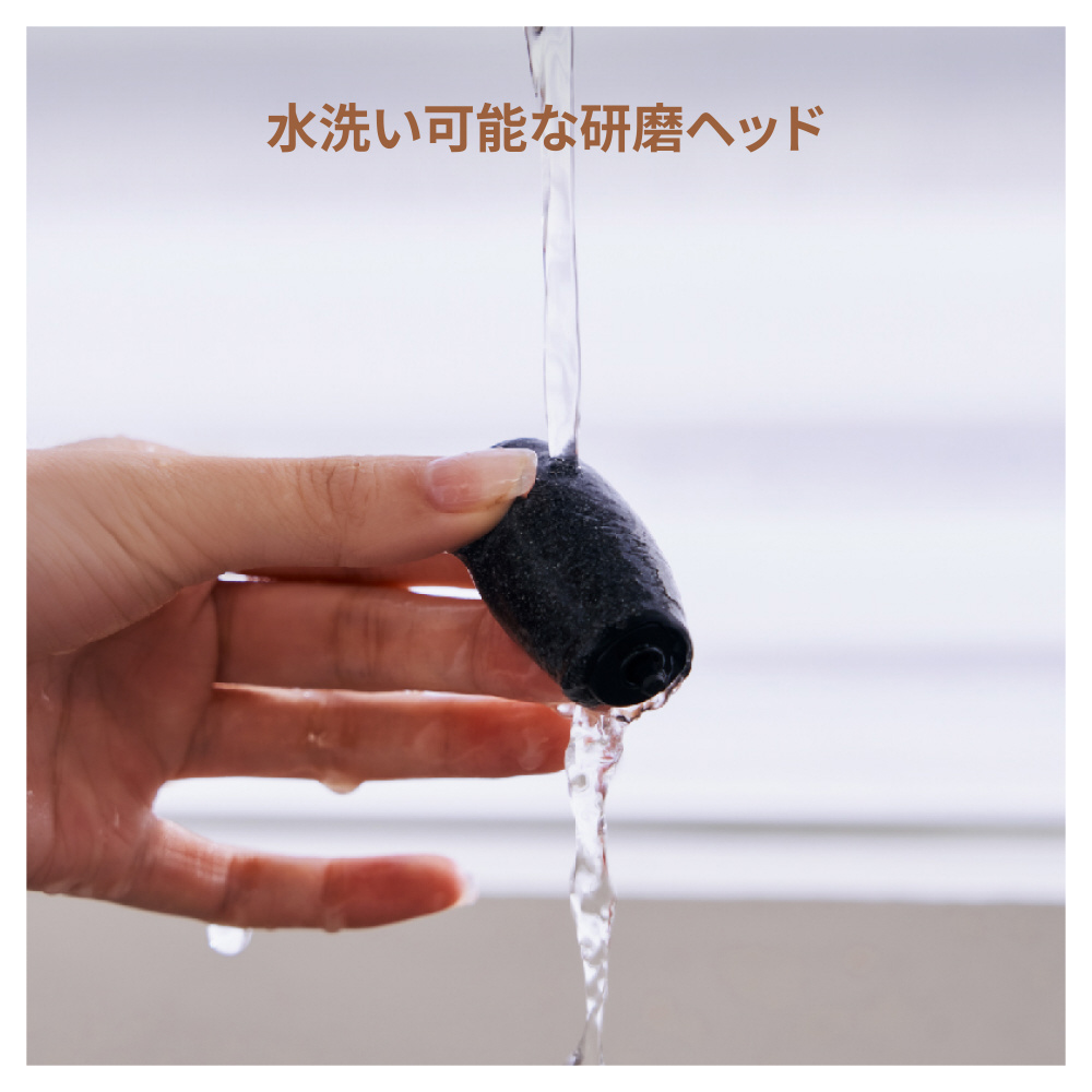 研磨ヘッドは簡単に取り外して水洗いができ、消耗時の交換もワンタッチでできるため、常に清潔な状態でご使用いただけます。