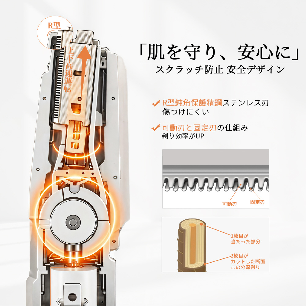 高精度研磨のステンレス刃が、細い産毛もすっきり処理。水洗い後も切れ味が持続し、衛生的で耐久性も◎。