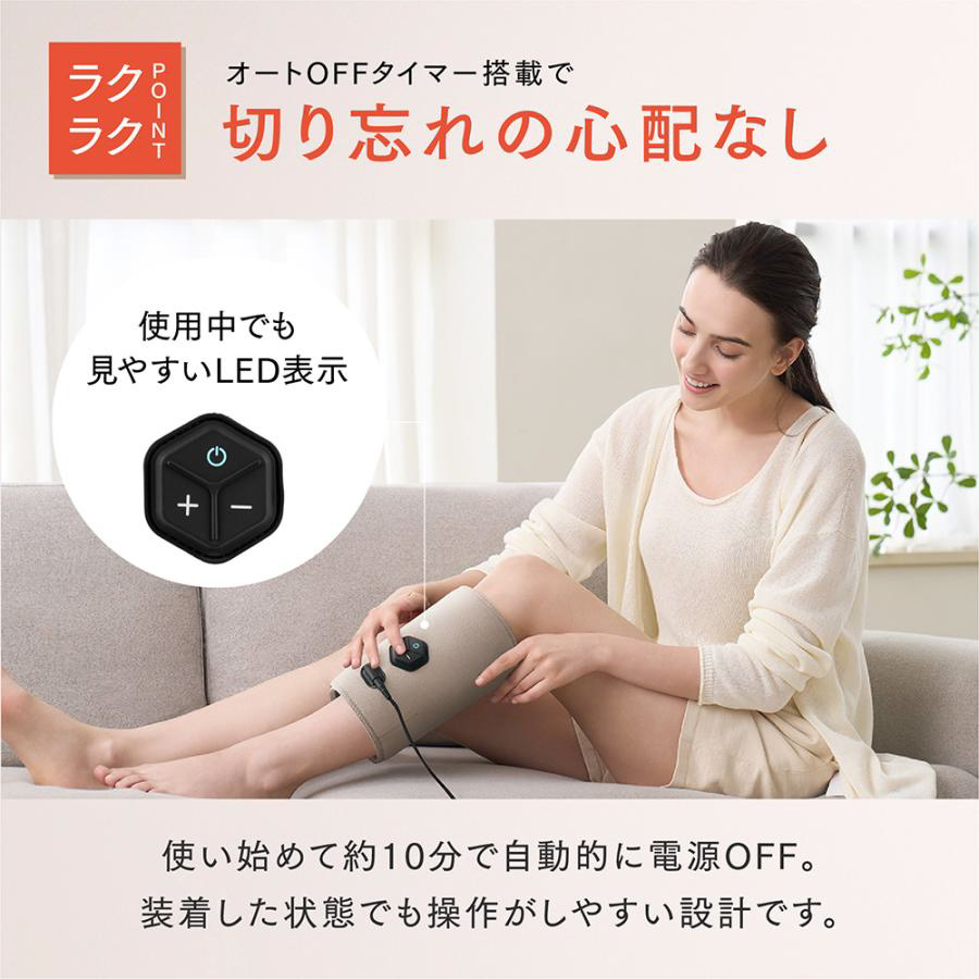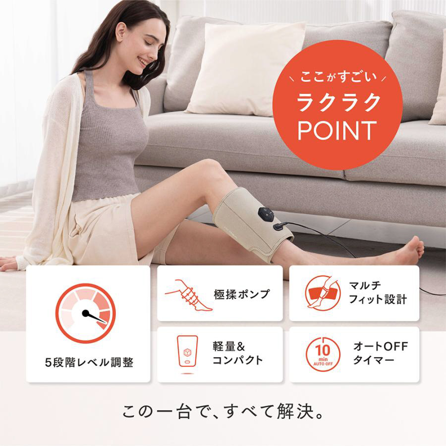 コンパクトなボディからは想像できないほどのパワフルさで、ふくらはぎを包み込むように刺激する高圧ふくらはぎケア