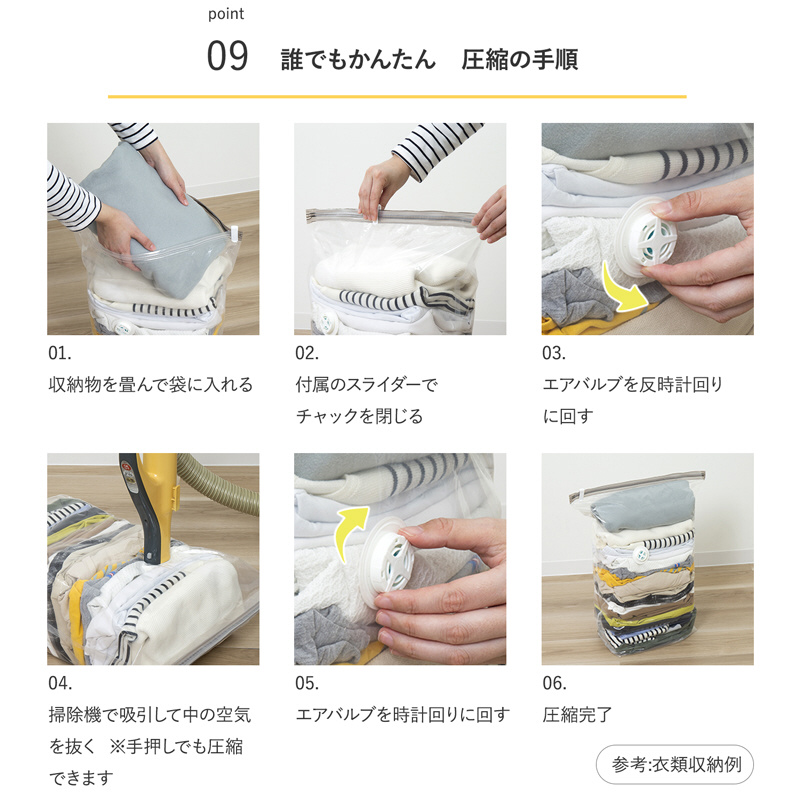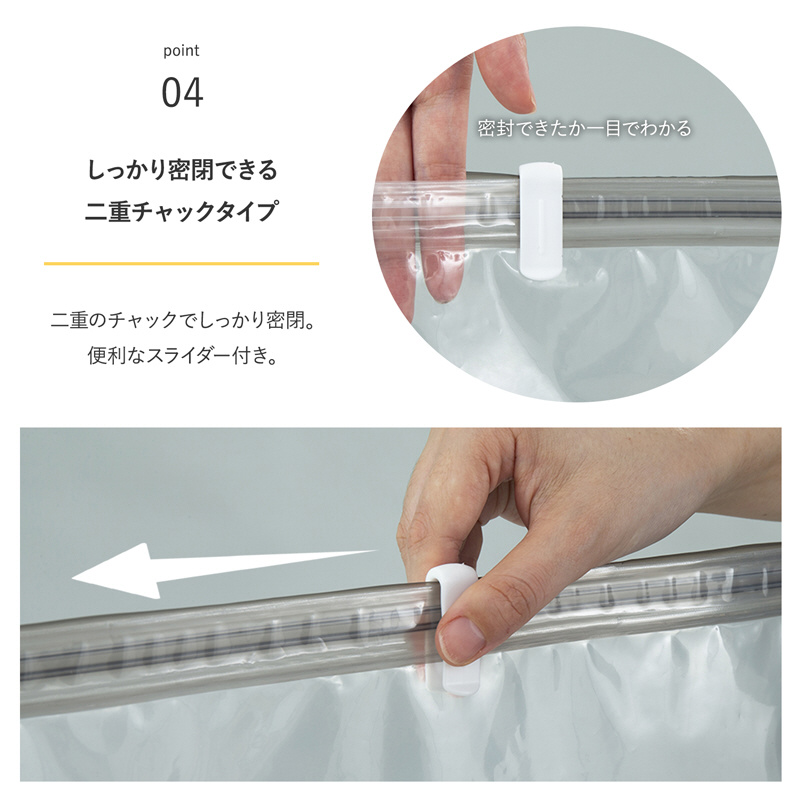 収納物を入れて、掃除機で一気にギュギュっと圧縮!(手押しでも圧縮できます)閉じると色が変わる2重チャックが空気漏れを防ぎ、しっかりと密閉できる圧縮袋。底マチ付きで出し入れもスムーズ。