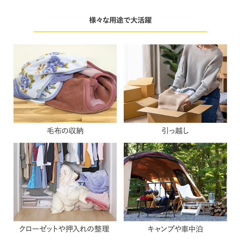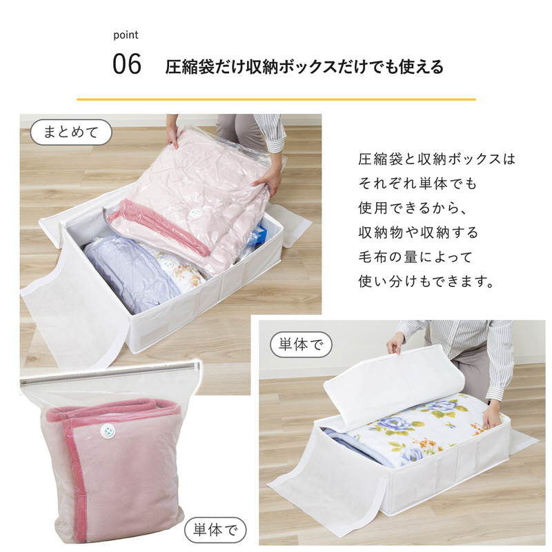 マチ付きで寝具類がしっかり入る圧縮袋と通気性の良い不織布製収納ケースのセット。かさばる寝具も省スペースでコンパクトにスッキリ収納。寝具を湿気やホコリから守り大切に保管します。