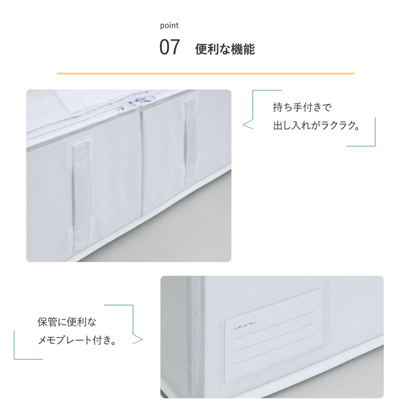 収納ケースは通気性に優れた不織布を使用しており、湿気がこもりにくい。中身を隠せるシンプルなホワイトカラーで見せる収納にも。メモプレートとネームホルダー付きなので、外から見えなくても収納物が分かる。