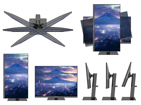 ■高さ調整が可能な昇降式多機能スタンドを搭載、最大130mmの範囲(横置時)で最適な高さに画面を調整可能です。また、縦画面として使用出来るピボット(回転)機能にも対応します。スイーベル(首振り)機能は、左右各30°の範囲で動かせます。