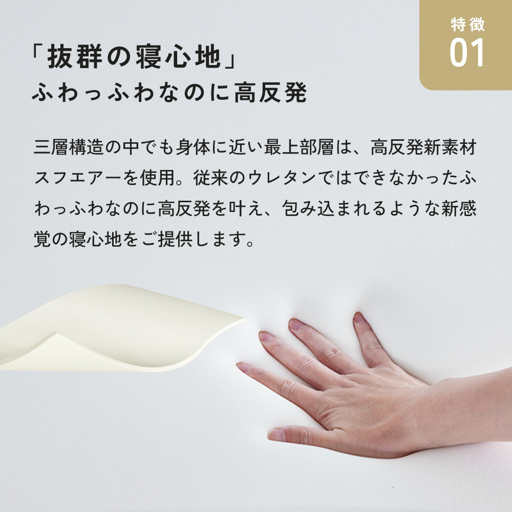 三層構造のなかでも身体に近い最上部層は、高反発新素材のスフエアーを使用。従来のウレタンではできなかった、ふわっふわなのに高反発を叶え、包み込まれるような新感覚の寝心地をご提供します。