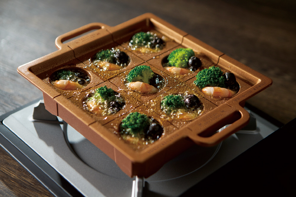 ■チタンコートプレート:本物感とお手入れのしやすさを両立。 まるで銅板のような美しさと焼き上がりを再現するチタンコートを採用。汚れがスルッと落ち、プレートは丸洗い可能な為、毎回のお手入れも簡単です。