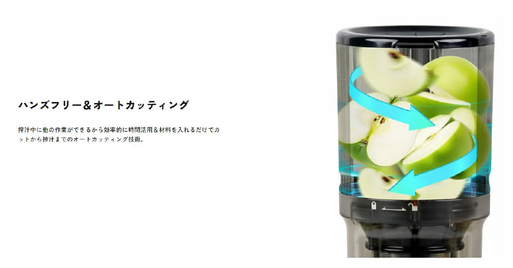 搾汁中に他の作業ができるから効率的に時間活用&材料を入れるだけでカットから搾汁までのオートカッティング技術。