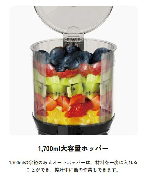 1700mlの余裕のあるオートホッパーは、材料を一度に入れることができ、搾汁がラク。