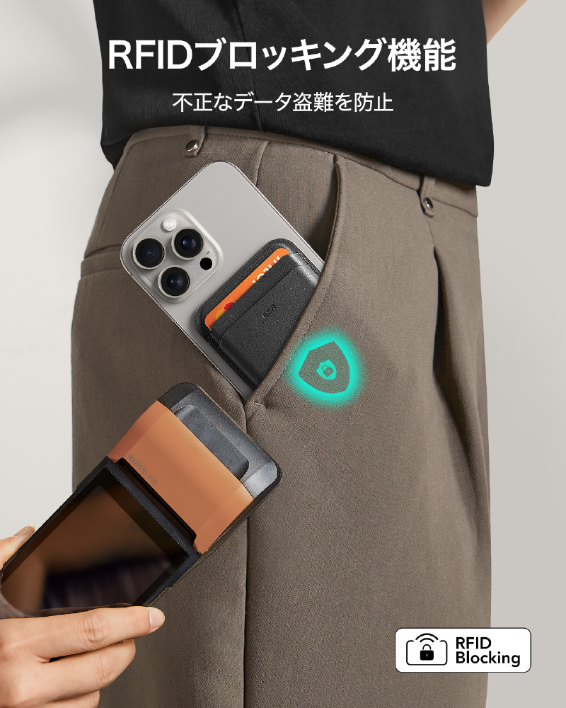 アップグレードされたMagSafeウォレットにはRFIDブロック技術が内蔵されており、不正スキャンによるクレジットカード、ID、個人データなどの電子データの盗難を防ぎます。