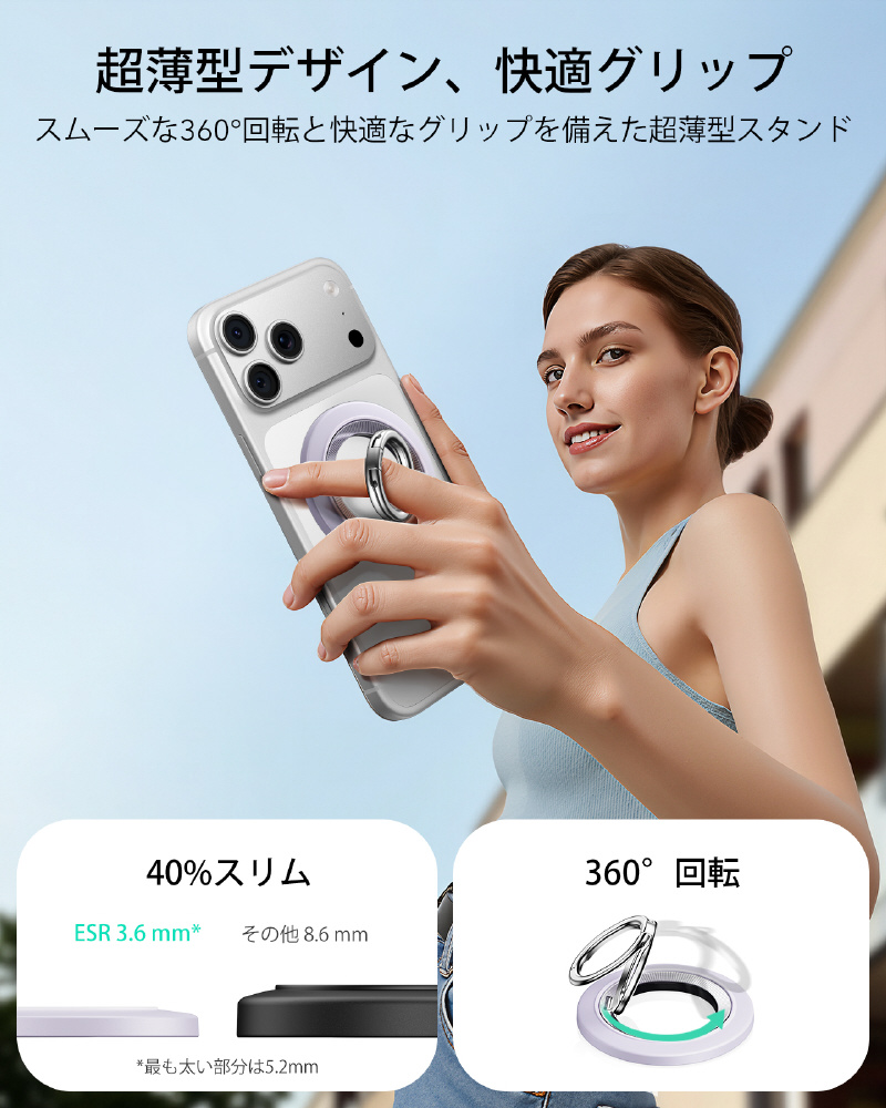 このマグネット式グリップは非常に薄く、最薄部でわずか3.6mm、最厚部でも5.2mmと、ほとんどの競合製品よりも40%薄くなっています。