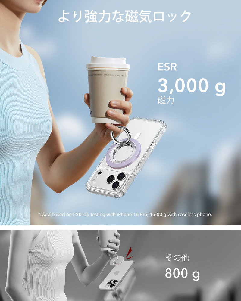公式のMagSafeケースまたはESR磁気ケースを使用すると、最大3,000gの磁気保持力が得られます。