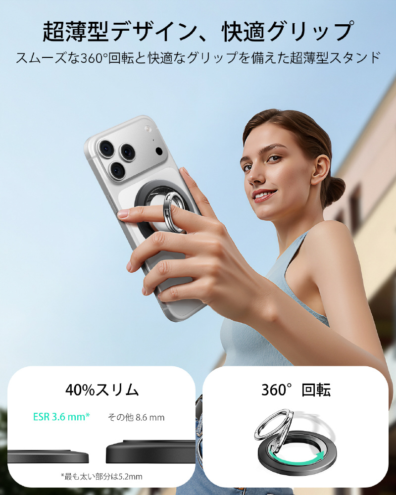 このマグネット式グリップは非常に薄く、最薄部でわずか3.6mm、最厚部でも5.2mmと、ほとんどの競合製品よりも40%薄くなっています。