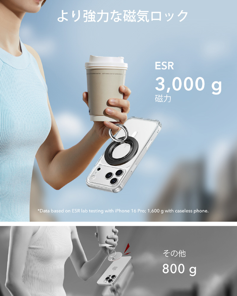 公式のMagSafeケースまたはESR磁気ケースを使用すると、最大3,000gの磁気保持力が得られます。