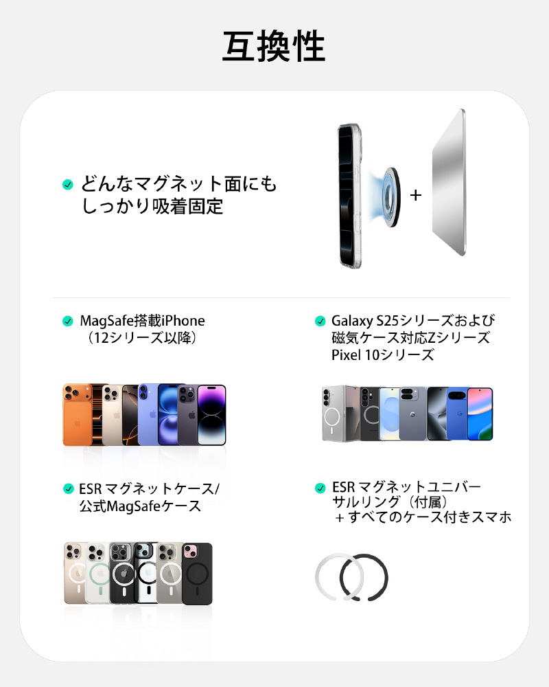 MagSafe 搭載 iPhone (12 シリーズ以降)/ESR 磁気ケース/公式 MagSafe ケース、および ESR 磁気金属リングを使用するすべてのスマートフォン (ケース付きスマートフォン)