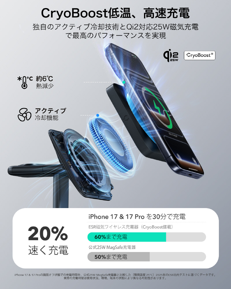 Qi2.2認証と電話冷却技術CryoBoostを搭載したiPhoneマグセーフ充電器は、最大25Wの超高速MagSafe充電を実現し、iPhone 16を25分で50%の充電が可能です。Qi2.2の磁気ワイヤレス設計により、サッと装着して充電できる快適さを楽しめます。