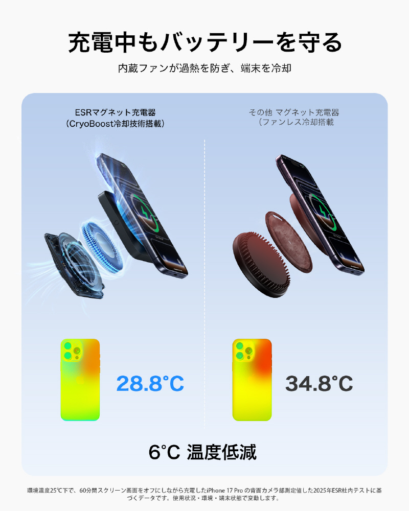アップグレードされたCryoBoost技術が充電中のiPhoneを積極的に冷却し、充電時には温度が約3.6℃低下し、最大で約6℃低下します(iPhone 16 Pro Max実機テストに基づくデータです)。冷却効果にが充電速度と安全性を高め、バッテリー寿命の延長にも寄与します。