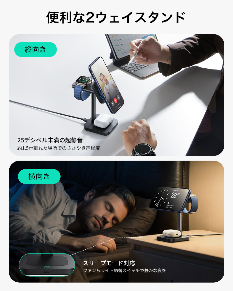 このワイヤレス充電器は1200gの磁力を持っています、iPhoneを縦置き・横置きいずれの状態でもしっかり固定。充電スタンドはベッドサイドの時計表示もサポートします、スタンバイモードでiPhoneを表示。夜間にはファンを停止する静音モードも搭載しています。