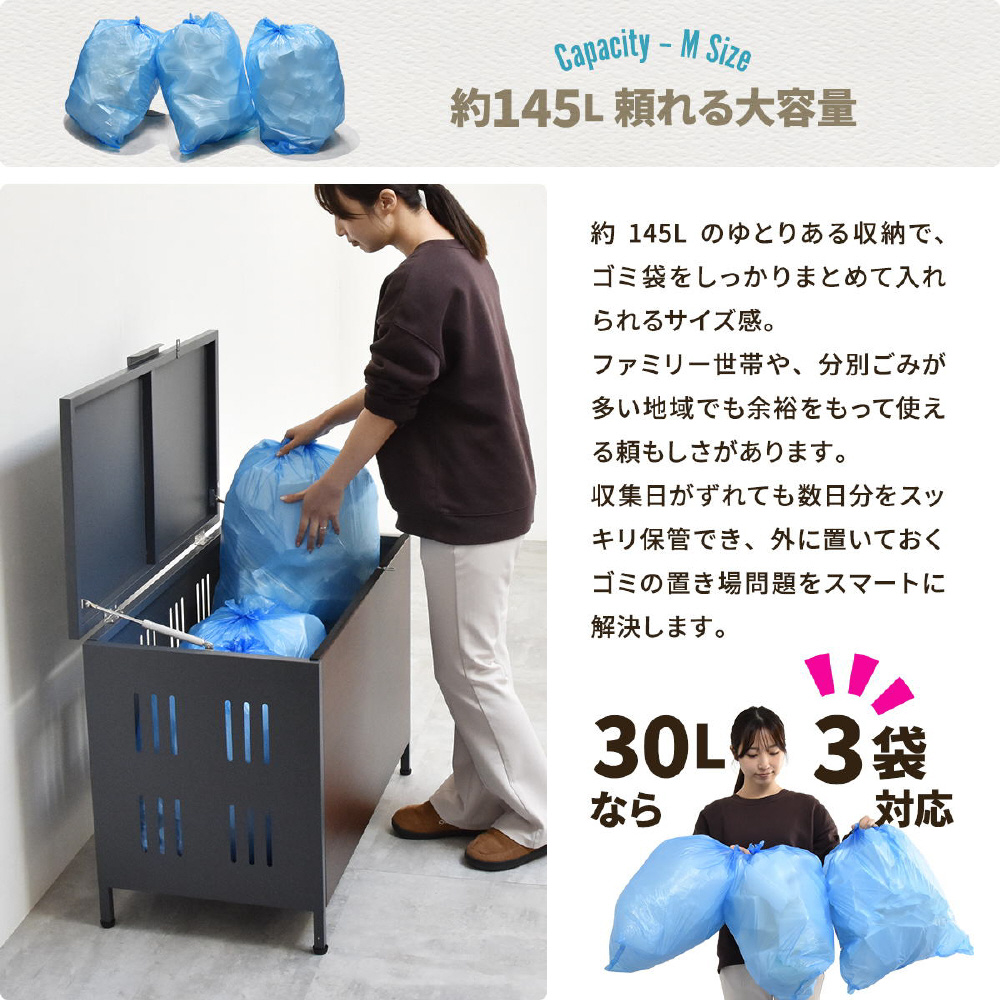 約145Lのゆとりある収納で、ゴミ袋をしっかりまとめて入れられるサイズ感。
