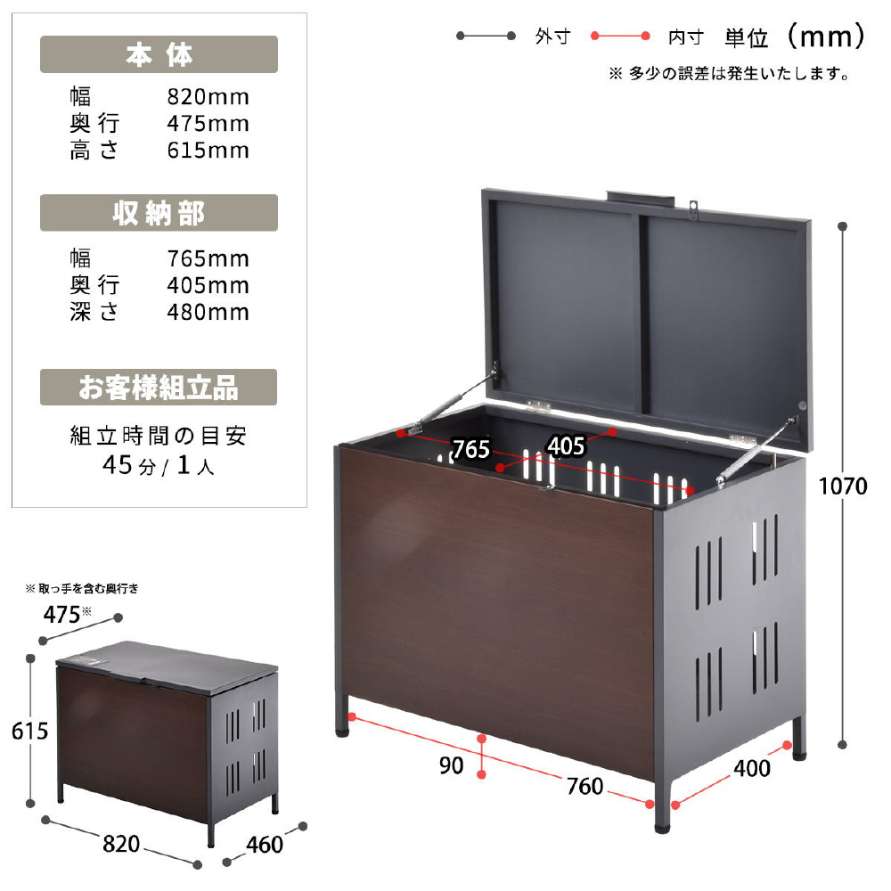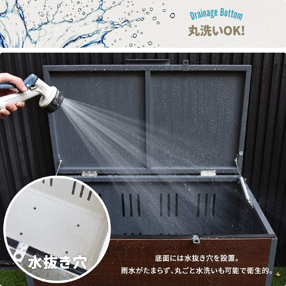 屋外でのゴミ収納やガーデニング用品の保管に便利な多目的収納ボックス。