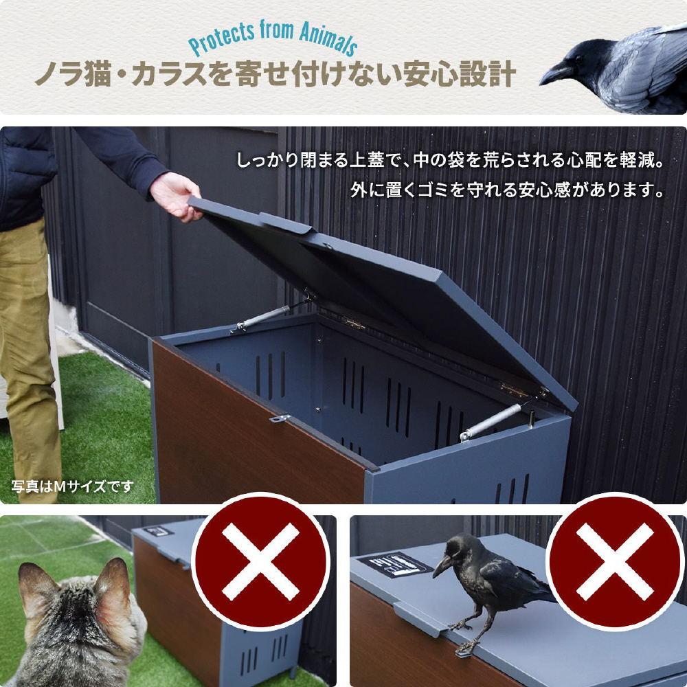 ゴミ収納だけでなく、南京錠等を付ければ簡易宅配ボックスにも使える仕様。