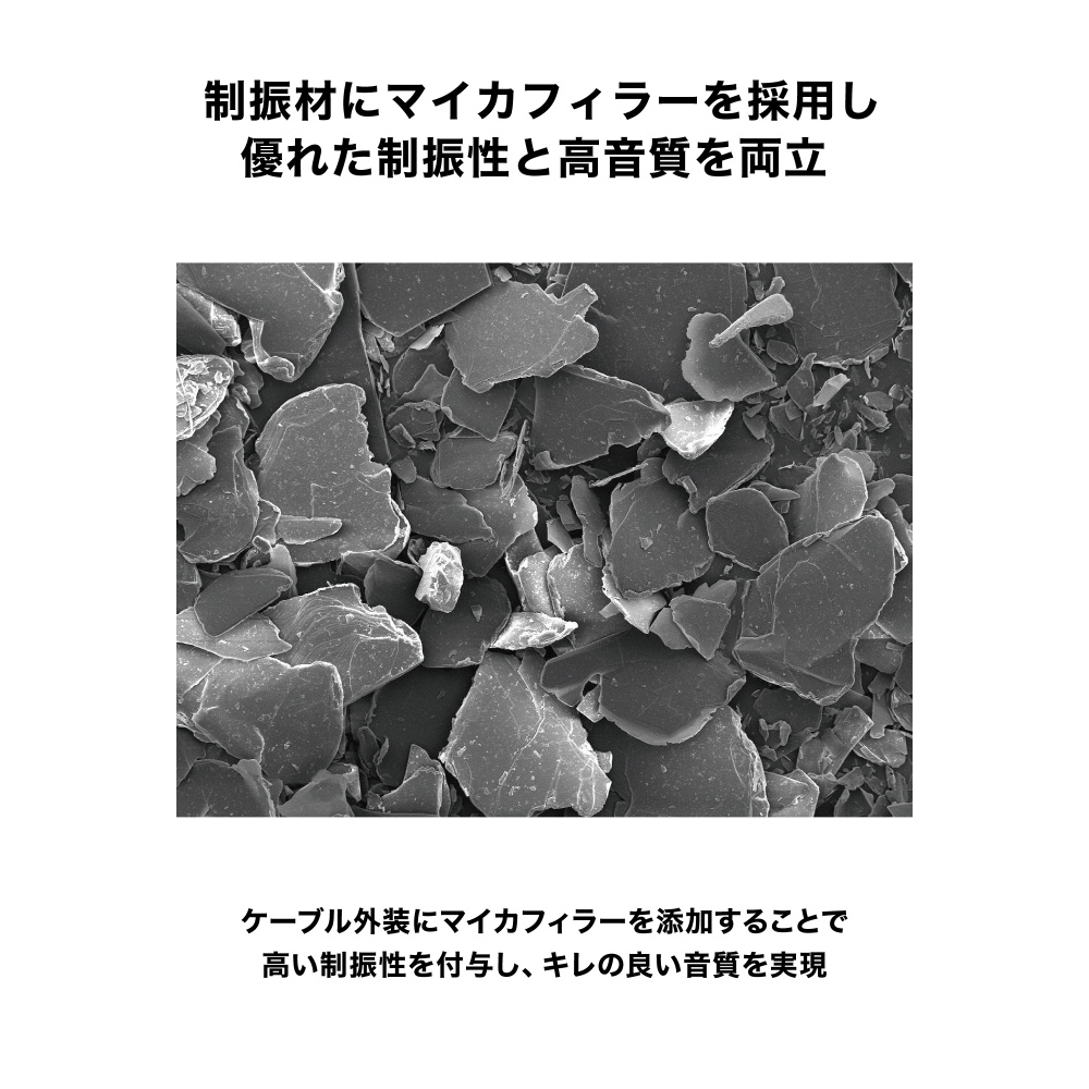 ケーブルのPVCシースにマイカフィラーを添加することで高い制振性を付与しており、これにより高域/低域ともにレンジが広がり、低域の量感が出るためドラムやベースのリズムにメリハリがつきます。また、解像度が向上することで音像が定まり、全体的にキレの良い音質傾向になります。