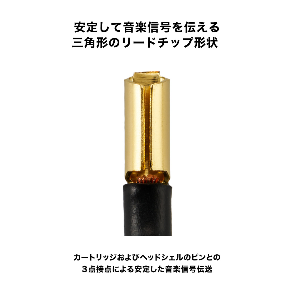 本製品では、リードチップの形状を三角形に設計することで、カートリッジおよびヘッドシェルのピンとの接点を確実に3点で確保。これにより、安定した音楽信号の伝送を実現し、音質の信頼性を高めています。