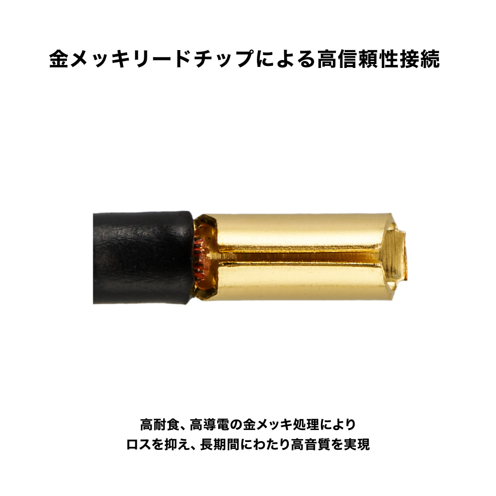 耐食性と導電性に優れた金メッキ処理を施したリードチップにより、安定した電気接触を確保。信号伝達のロスを最小限に抑え、長期間にわたって高音質を維持します。