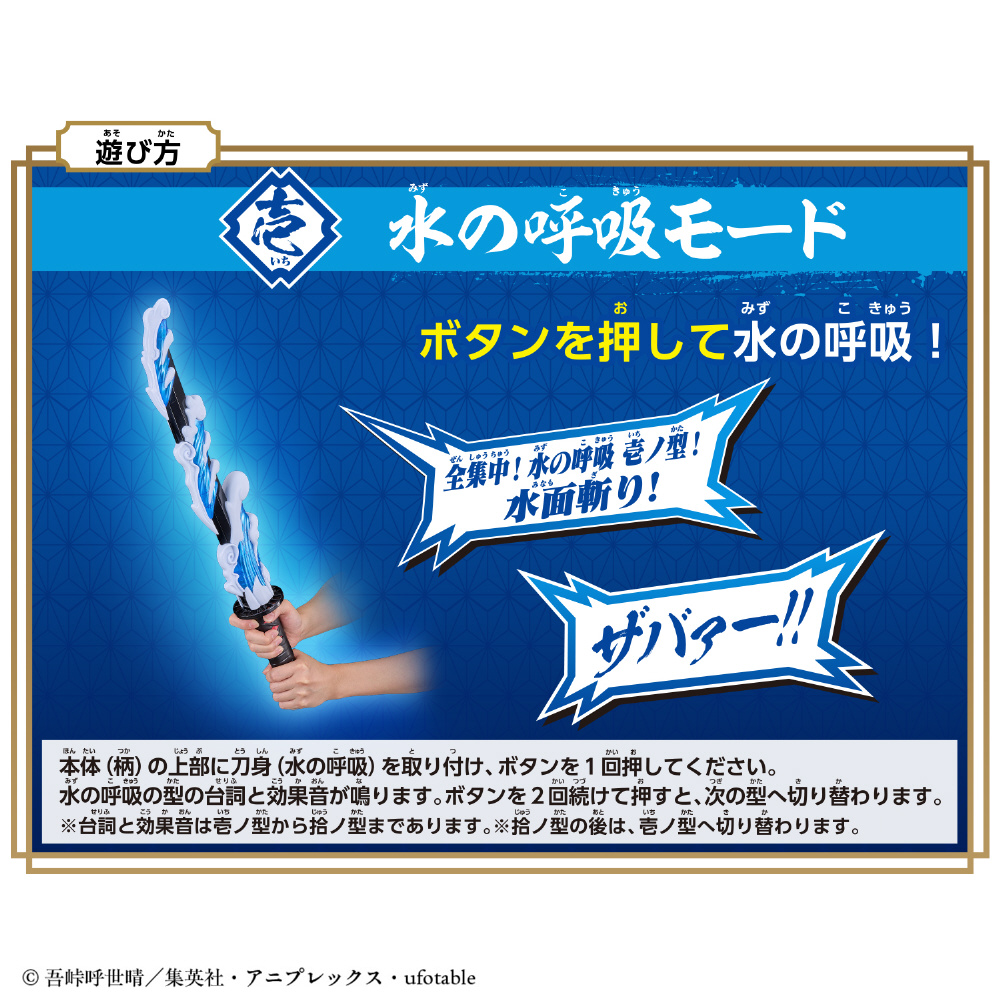 本体(柄)に刀身がついていると「水の呼吸モード」になり、ボタンを押して台詞と効果音を再生し、なりきり遊びが楽しめます。