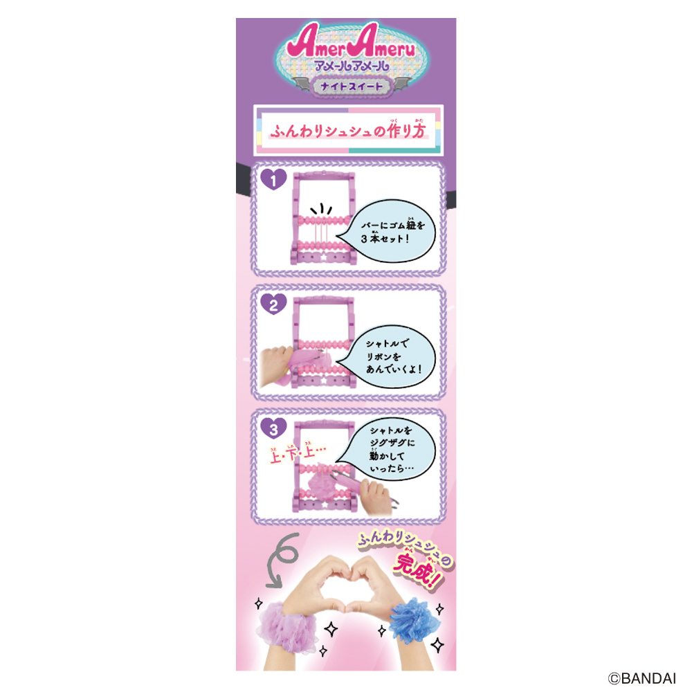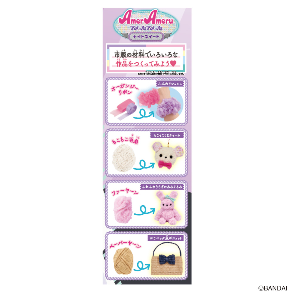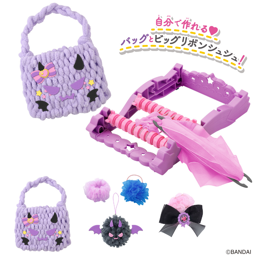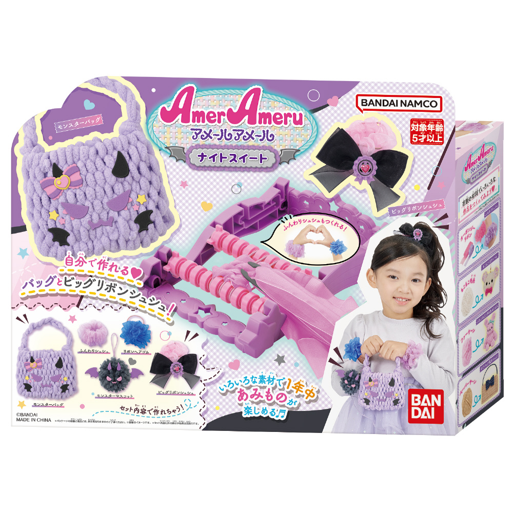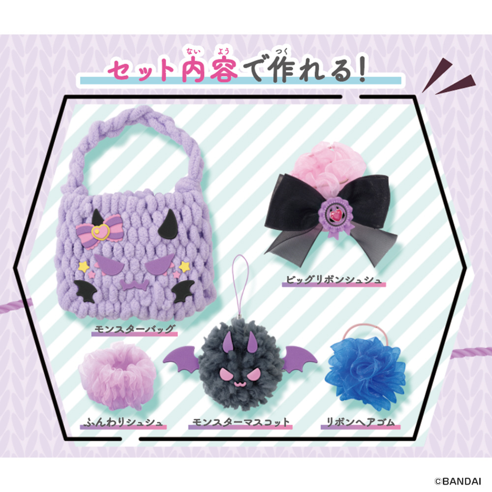 いろいろな素材で簡単にあみものが楽しめるメイキングトイ『アメールアメール』がリニューアルして登場!紫×ピンクのモンスターをテーマに、バッグやヘアアクセサリーが自分で作れます。セット内容だけでモンスターバッグ・モンスターマスコット・ふんわりシュシュ・リボンヘアゴム・ビッグリボンシュシュが作れます。