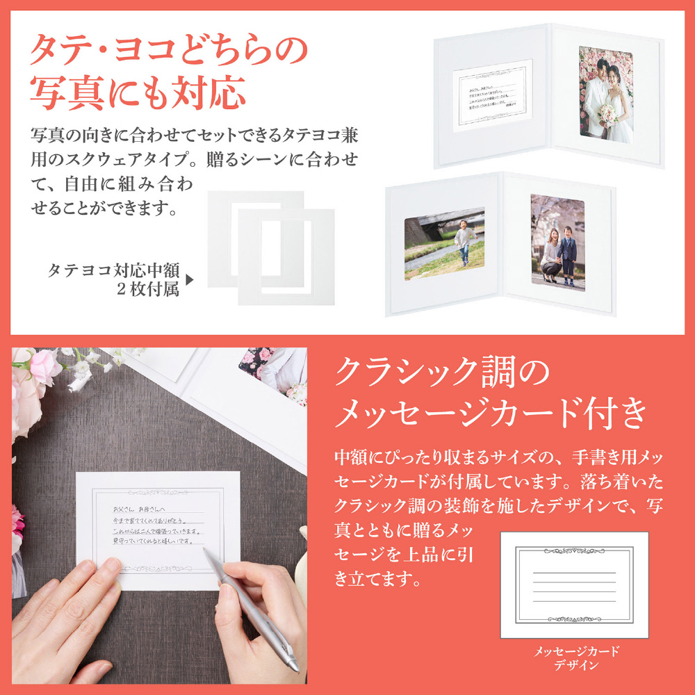 形状は、写真の向きを選ばずタテヨコ自由にセットできるスクウェアタイプを採用しています。