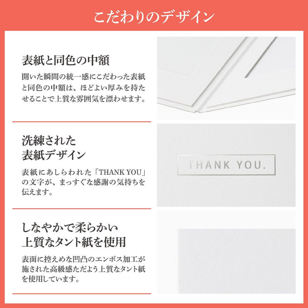 素材には高級感あふれる上質な紙を使用し、中額も表紙と同色で統一。洗練された印象とともに、付属するクラッシック調の手書き用メッセージカードが贈り物をより上品に引き立てます。