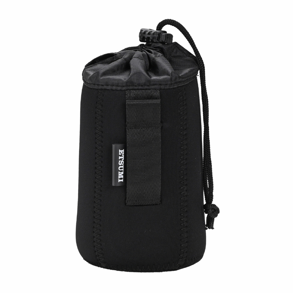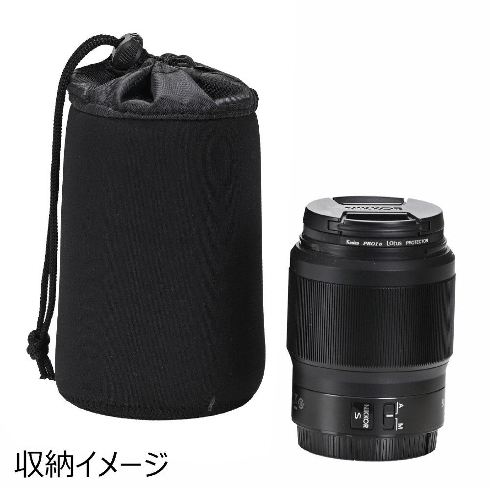 一眼レフカメラ・ミラーレスカメラ用交換レンズを衝撃やキズから守る、巾着タイプのレンズポーチ。厚さ約5mmのウレタンクッションを採用し、持ち運び時や保管時の振動・衝撃をしっかり吸収します。厚手でクッション性に優れたレンズ保護ポーチのため、カメラバッグ内で他の機材やアクセサリーと接触してもレンズを安全に保護。大切な交換レンズのキズや破損防止に役立ちます。レンズ先端を保護するクッションパッド付き。