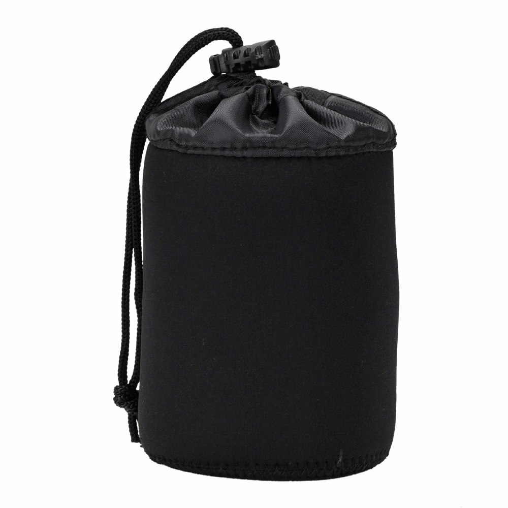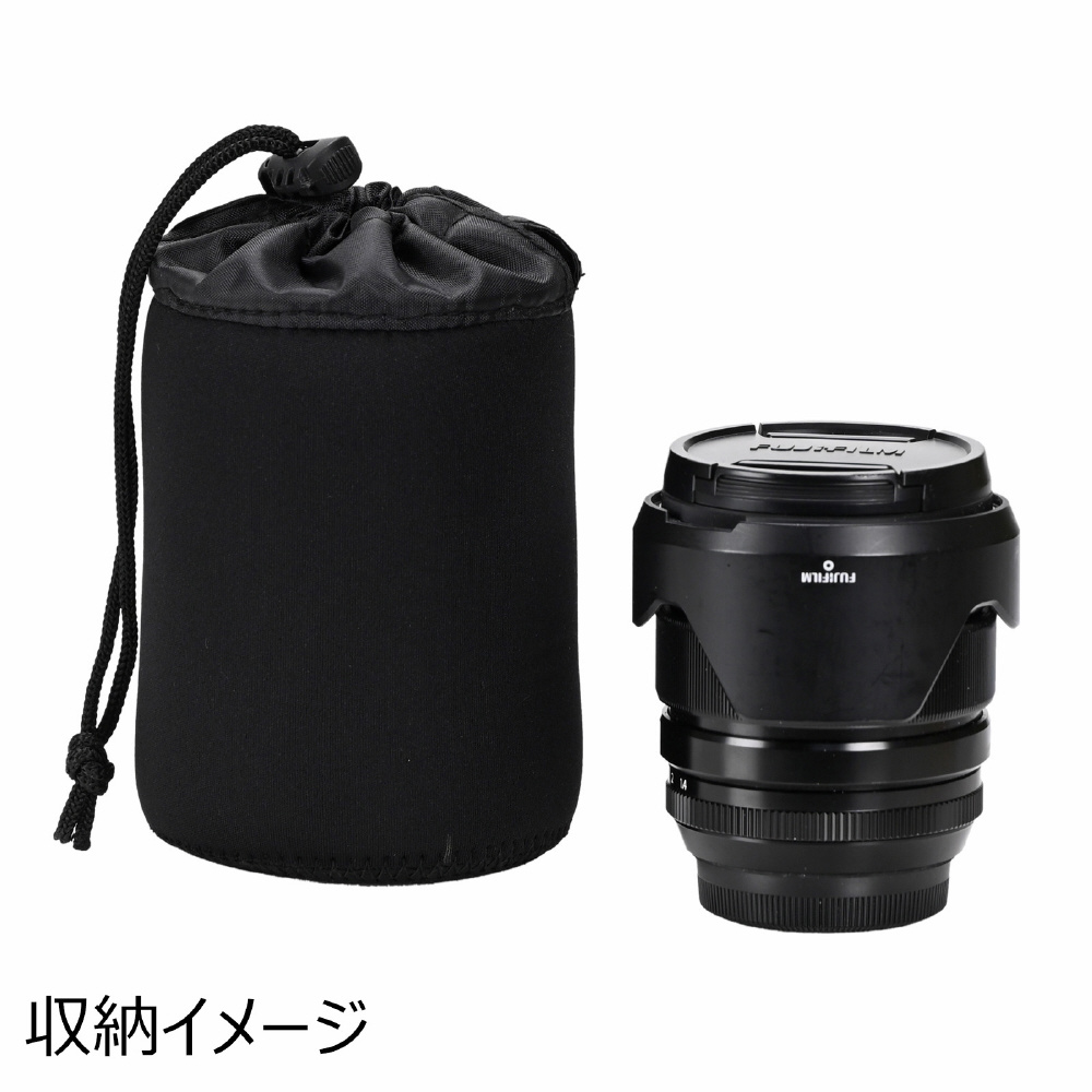 一眼レフカメラ・ミラーレスカメラ用交換レンズを衝撃やキズから守る、巾着タイプのレンズポーチ。厚さ約5mmのウレタンクッションを採用し、持ち運び時や保管時の振動・衝撃をしっかり吸収します。厚手でクッション性に優れたレンズ保護ポーチのため、カメラバッグ内で他の機材やアクセサリーと接触してもレンズを安全に保護。大切な交換レンズのキズや破損防止に役立ちます。レンズ先端を保護するクッションパッド付き。