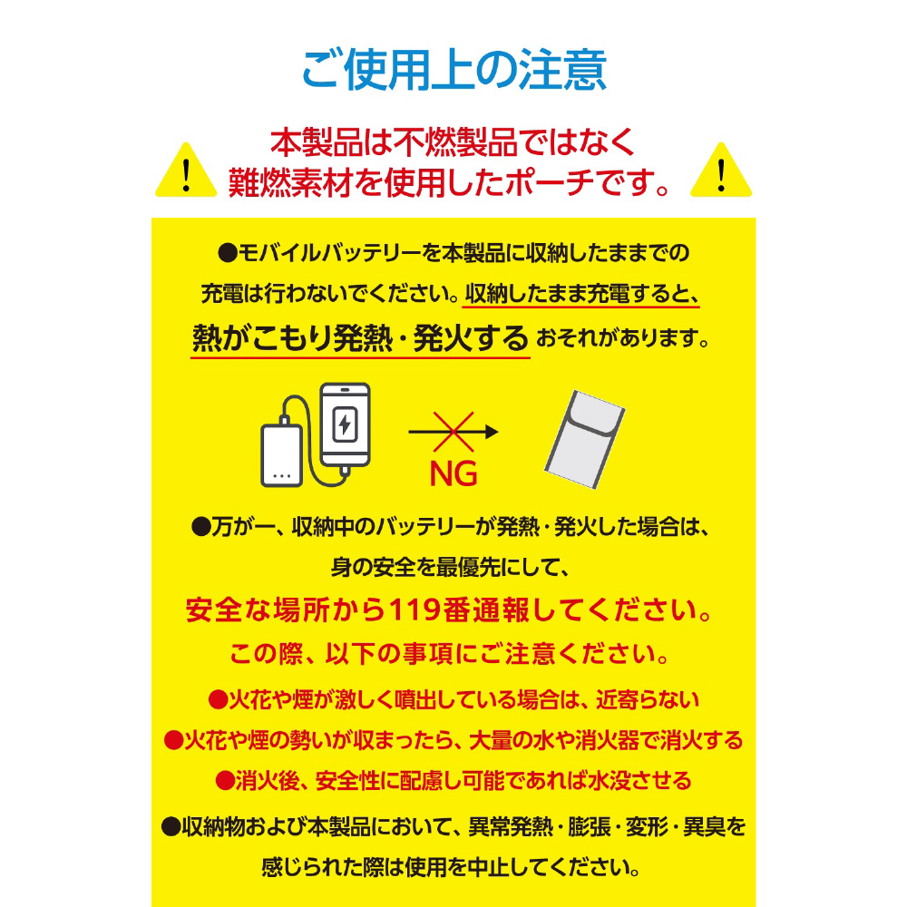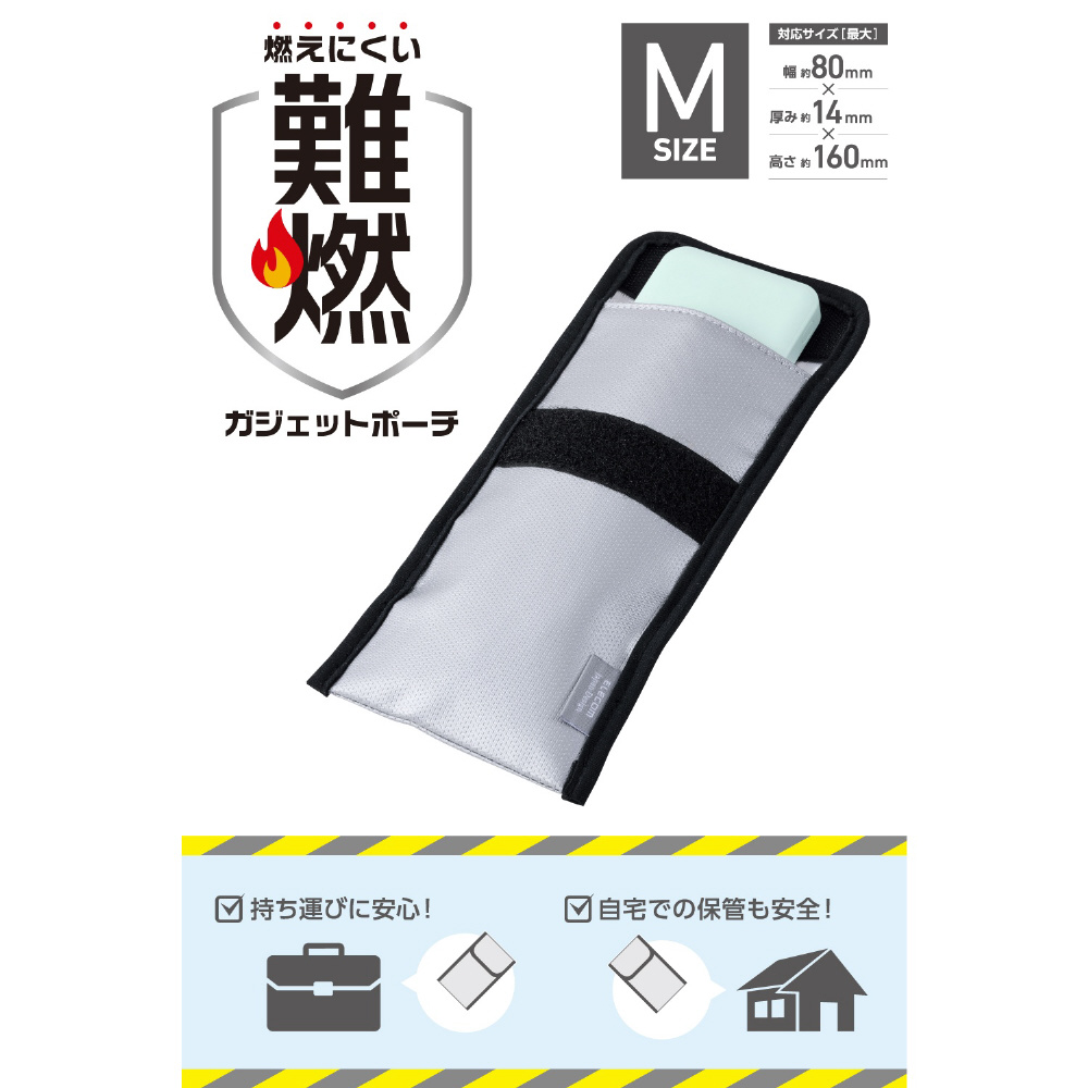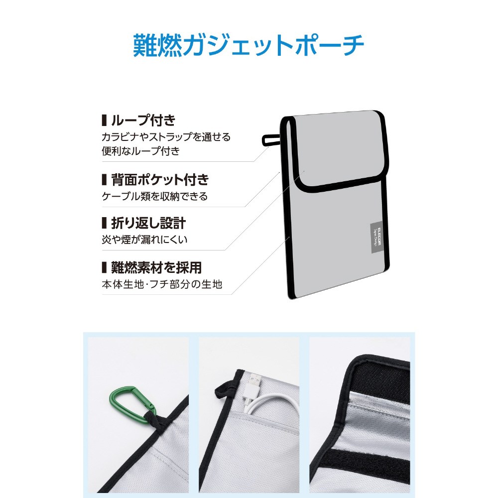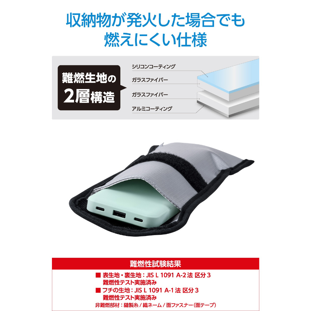 いざというときの備えに!燃えにくい素材のガジェットポーチです。難燃性試験をクリアした生地を二重に使い、すき間をしっかり塞ぐ構造を採用。発火したときの延焼や、火・煙の漏れを抑えます。背面ポケットにはケーブルも収納できて便利。飛行機内への持ち込みや持ち運びに便利なサイズです。