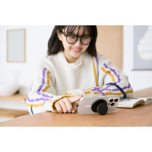 MagSafe対応 スマホスタンド スマホグリップ 両面マグネット キッチン・冷蔵庫・壁にマグネット固定 自撮り・ダンス動画・動画視聴 iPhoneなどスマホ用 メタルプレート付属 ブラック P-DSMMWBK