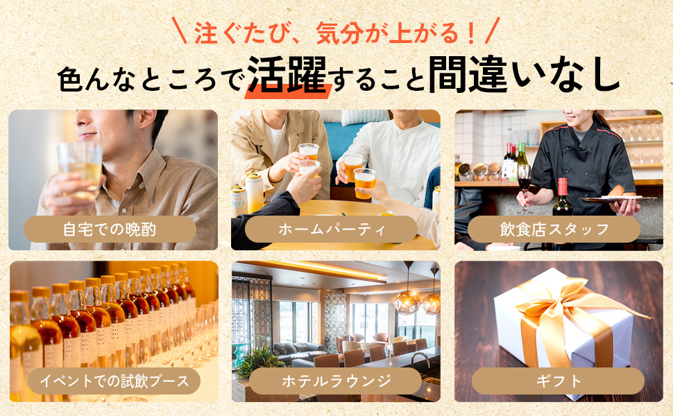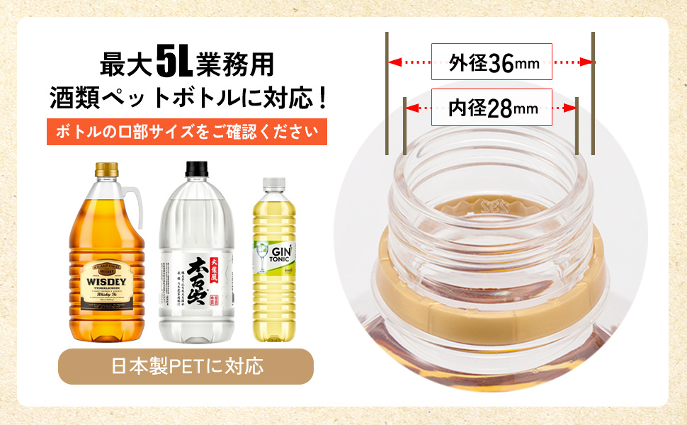 ■大容量ペットボトルに対応 1.8L、1.92L、2.7L、4L、5Lの日本製業務用酒類ペットボトルに装着可能。