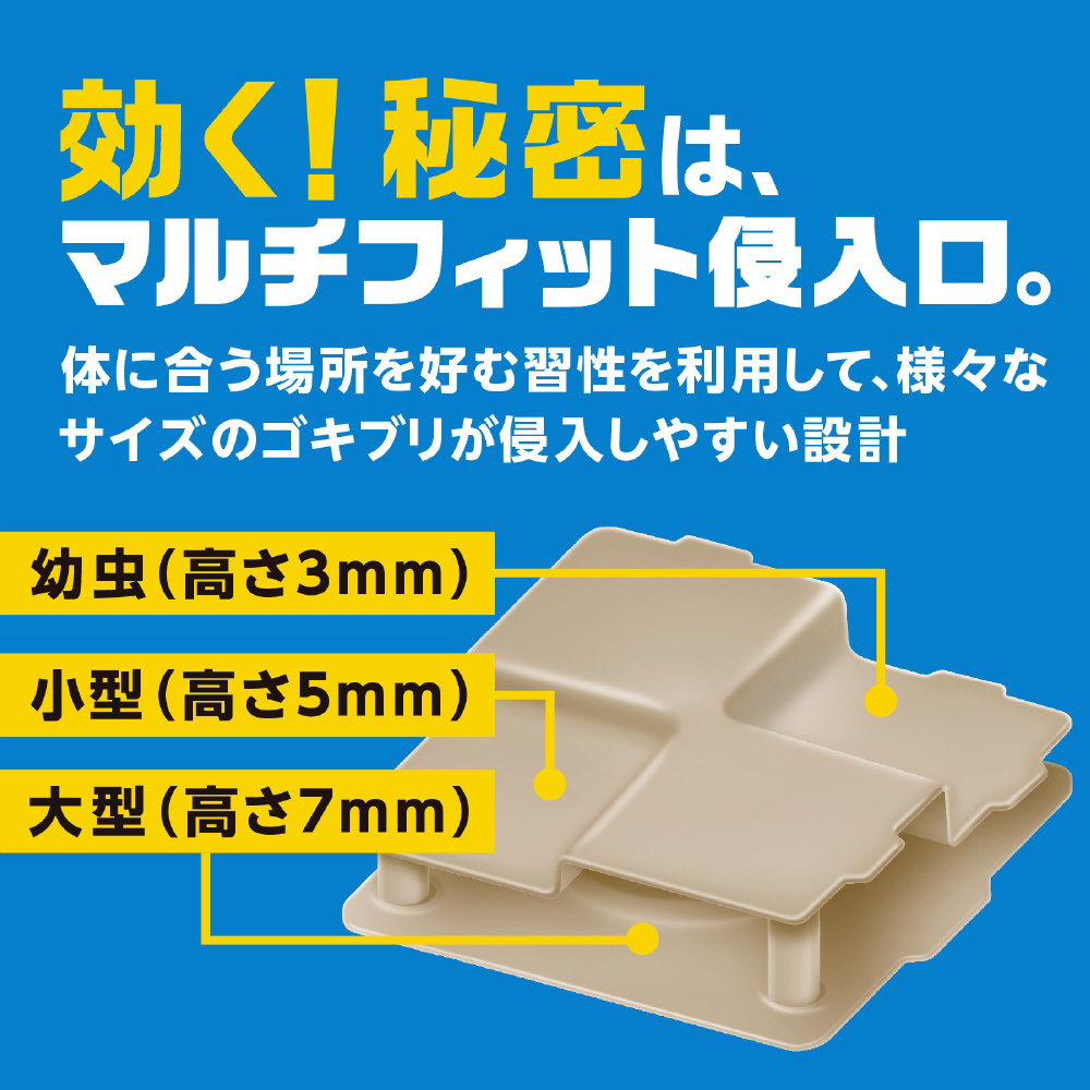 幼虫から大型まで様々なサイズのゴキブリに対応した高さの侵入口により、ゴキブリを逃さず駆除します。