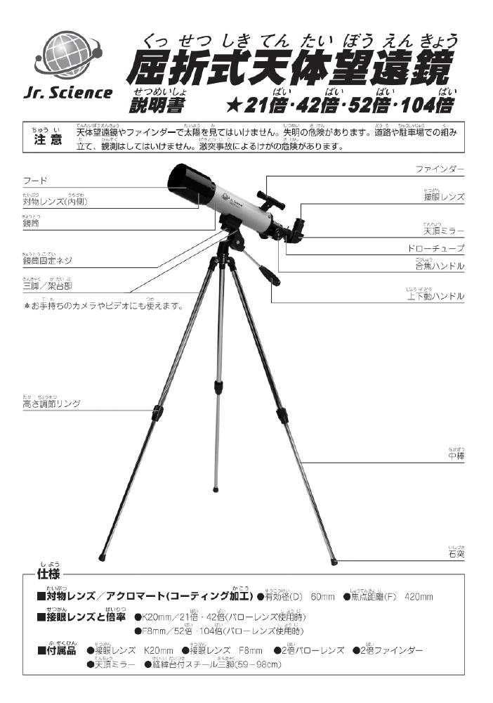 60mm 屈折式天体望遠鏡 104倍 Jr. Science ホワイト SO90354 [屈折式 /経緯台式]