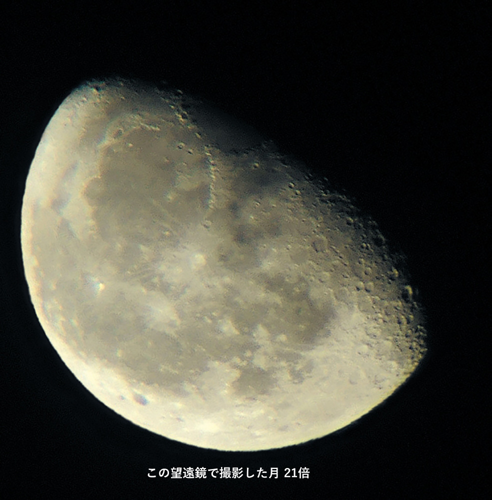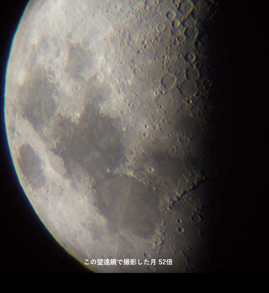 この望遠鏡では、月のクレーターがはっきり見え、月の表面の凹凸なども良くわかります。土星の環が見えます。木星は茶色の縞模様とガリレオ衛星が見えます。星雲・星団などを観察することができます。
