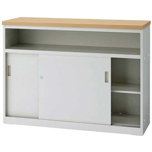 中棚付書庫型ハイカウンターW1200mmタイプ。天板カラーはナチュラル、本体はオフィスになじみやすいネオホワイトです。