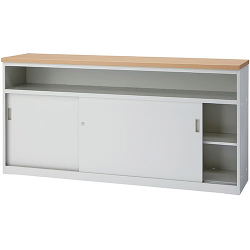 中棚付書庫型ハイカウンターW1800mmタイプ。天板カラーはナチュラル、本体はオフィスになじみやすいネオホワイトです。