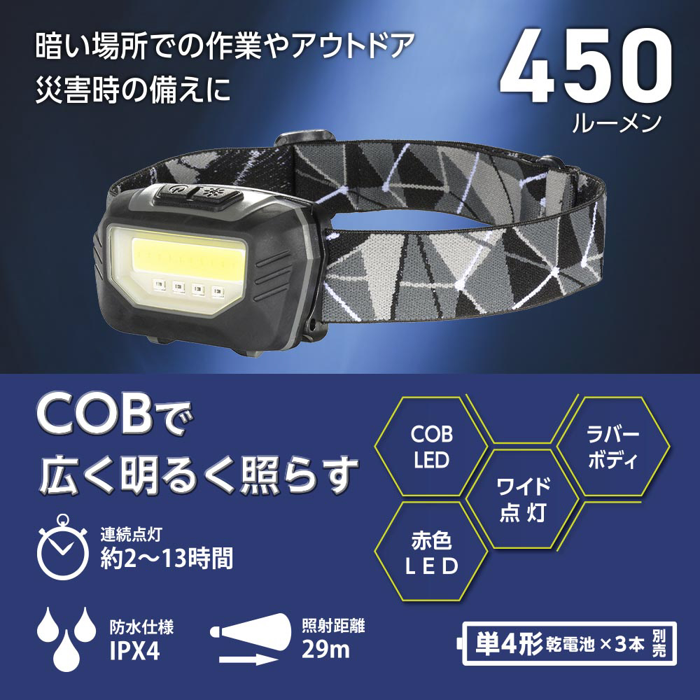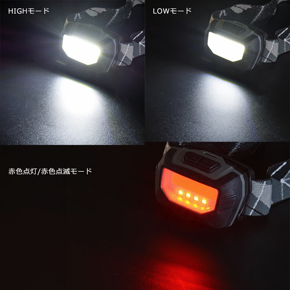 ■ 連続点灯時間:HIGHモード…約2時間、LOWモード…約13時間、赤色点灯モード…約33時間 ※未使用・新品アルカリ乾電池使用時、電池の性能や使用状況により異なります。