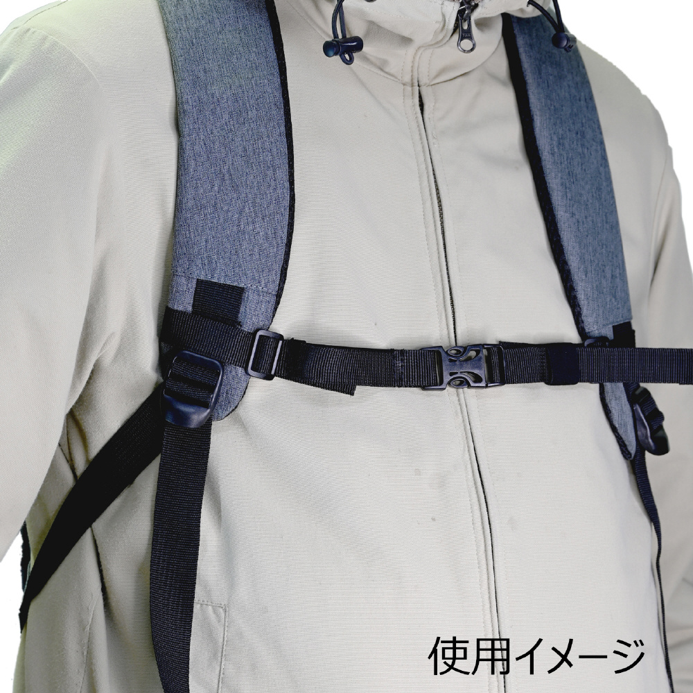 移動中のリュックのずれ落ちを防止するチェストベルト。胸の前で留めて固定することで、リュックやリュックベルトのずれ落ちを防ぎます。ワンタッチのバックルで簡単に着脱できます。前傾姿勢でずれやすい自転車での通勤や通学にも。