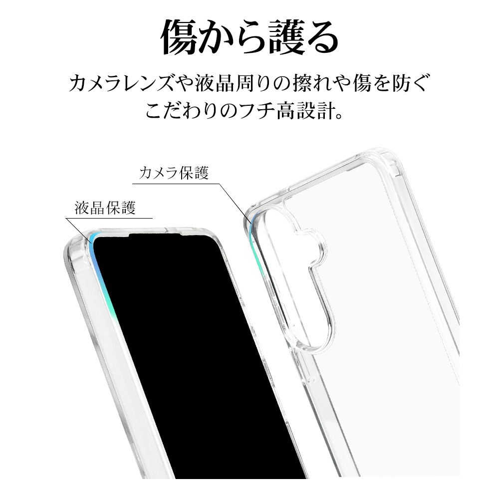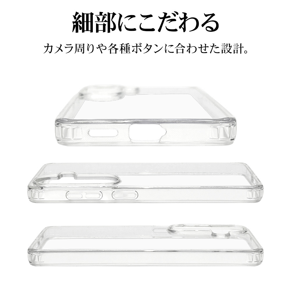 ●側面は弾力と柔軟性を兼ね備えたTPU素材で端末を衝撃から保護し、着脱も簡単です。※衝撃吸収については、一般的なポリカーボネート製ケースと比較した自社検証結果で、無破損、無故障を保証するものではありません。