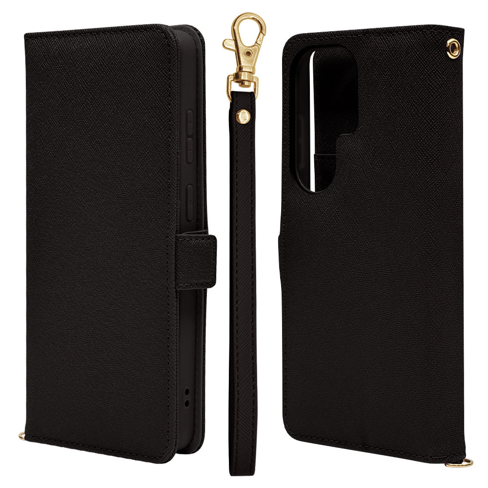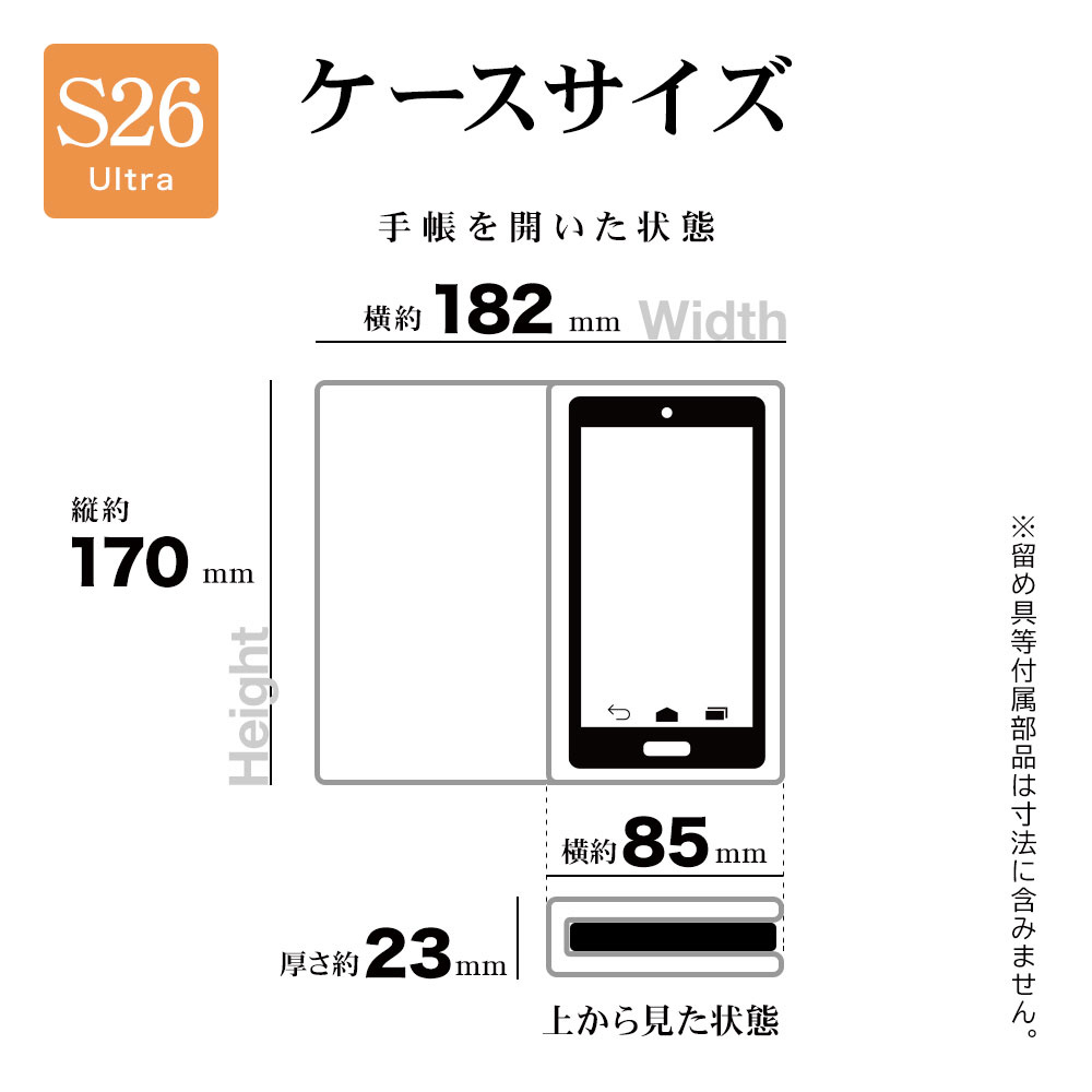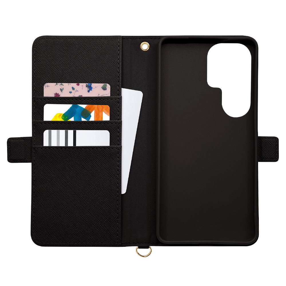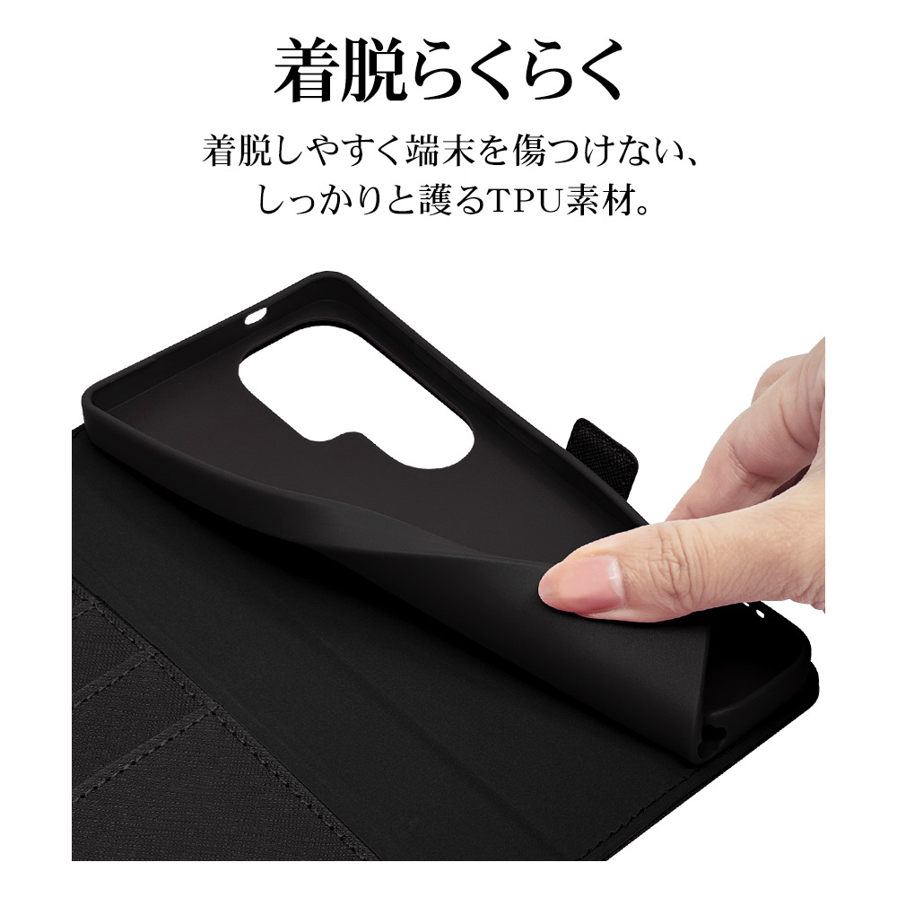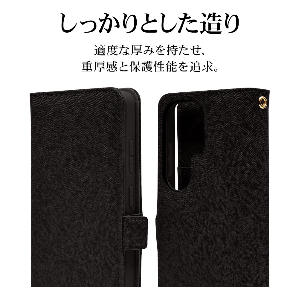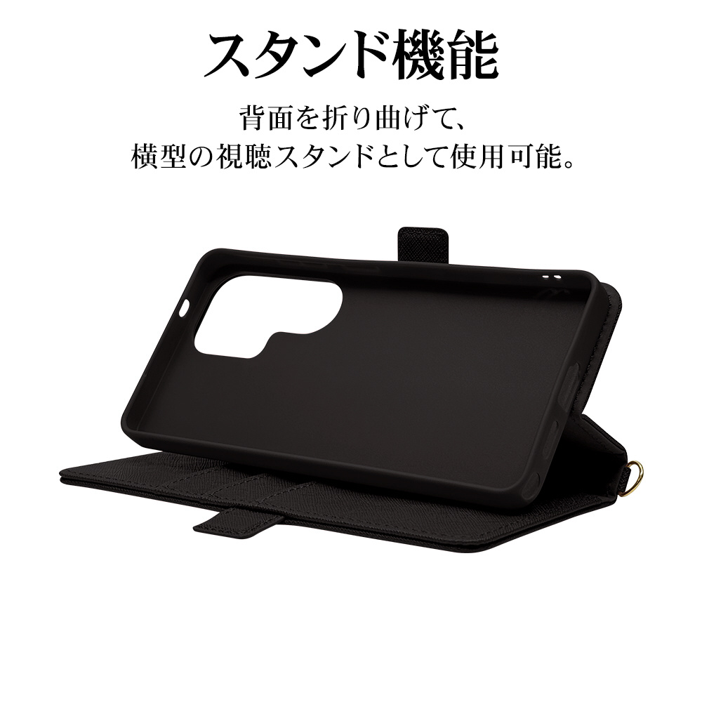 液晶画面側と背面側の両面を保護できるハンドストラップ付きの手帳型ケースです。