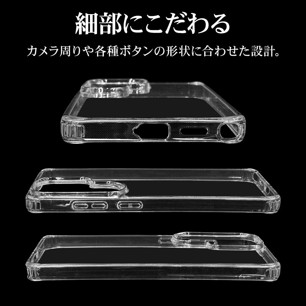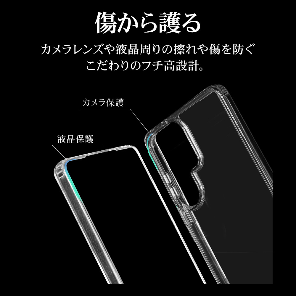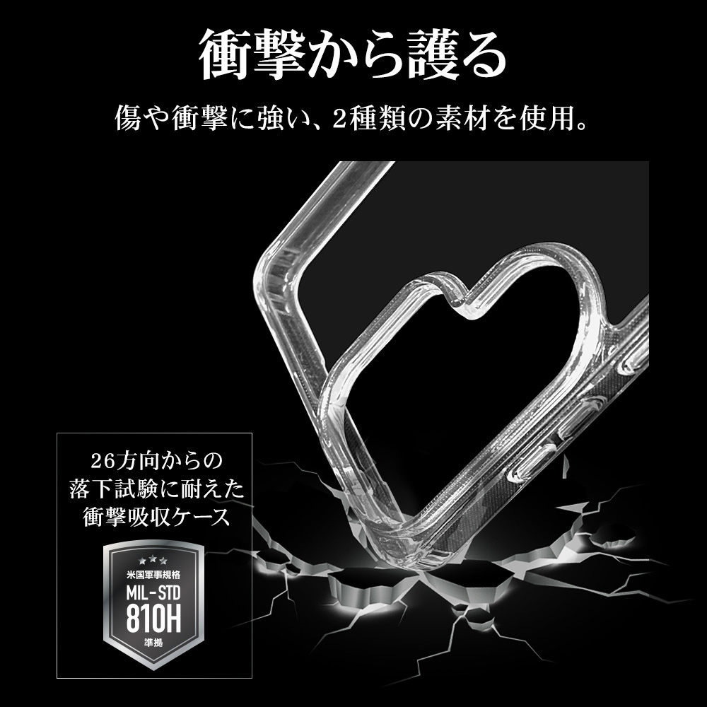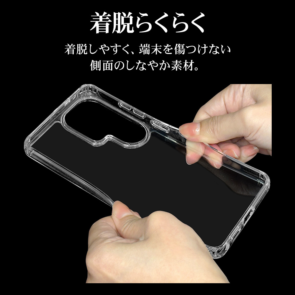 ●側面は弾力と柔軟性を兼ね備えたTPU素材で端末を衝撃から保護し、着脱も簡単です。※衝撃吸収については、一般的なポリカーボネート製ケースと比較した自社検証結果で、無破損、無故障を保証するものではありません。